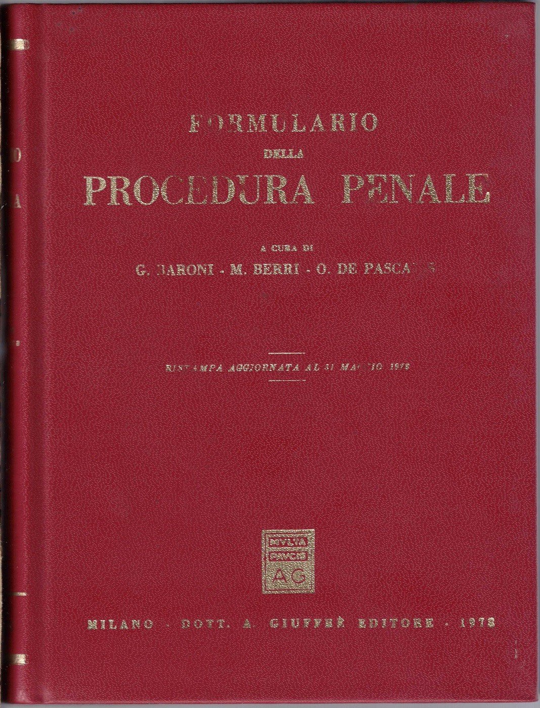 Formulario della procedura penale, a cura di G. Baroni, M. Berri, O. De Pascalis, Dott. A. Giuffrè Editore, Milano 1978, pp. LXXI, 640, ristampa aggiornata al 31 maggio 1978, cm 17, legatura in similpelle ed. con titoli al dorso e al piatto. Leggeri segni del tempo, per il resto ben conservato.