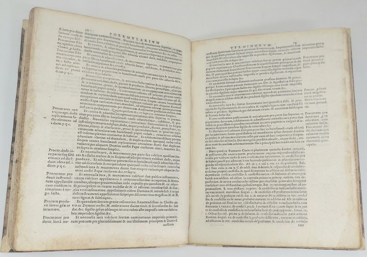 >in-4, pp. (24), 224, legatura moderna mezza pergamena ed angoli, tass. in pelle con titolo oro al dorso. Stemma papale sul titolo, testo in car. tondo e note marginali a stampa. Complesso testo giuridico ad uso della Curia di Roma; vi si contengono formule giuridiche che riproducono nell'insieme altrettante norme o modelli per atti forensi o amministrativi, particolarmente in uso nel campo del diritto canonico e nella prassi curiale ecclesiastica. Discreto esemplare (con macchie sul frontespizio e tracce d'umido ).