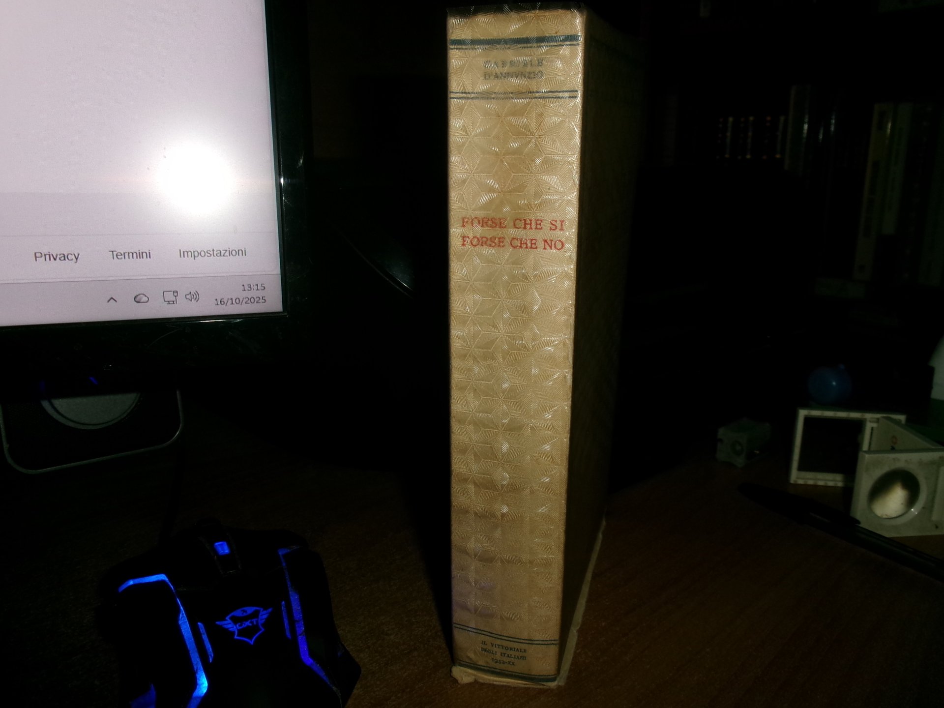 Gabriele D' Annunzio. Roma, << Il Vittoriale degli Italiani, 1942>>. Forse che si forse che no. In-8°, br., cop. orig. (8), 550, (2) pp. e 2 facsimili ripiegati f.t. Esemplare ben conservato con 2 sovracopertine (una in acetato particolare). Neg. lett. mod. mob. H