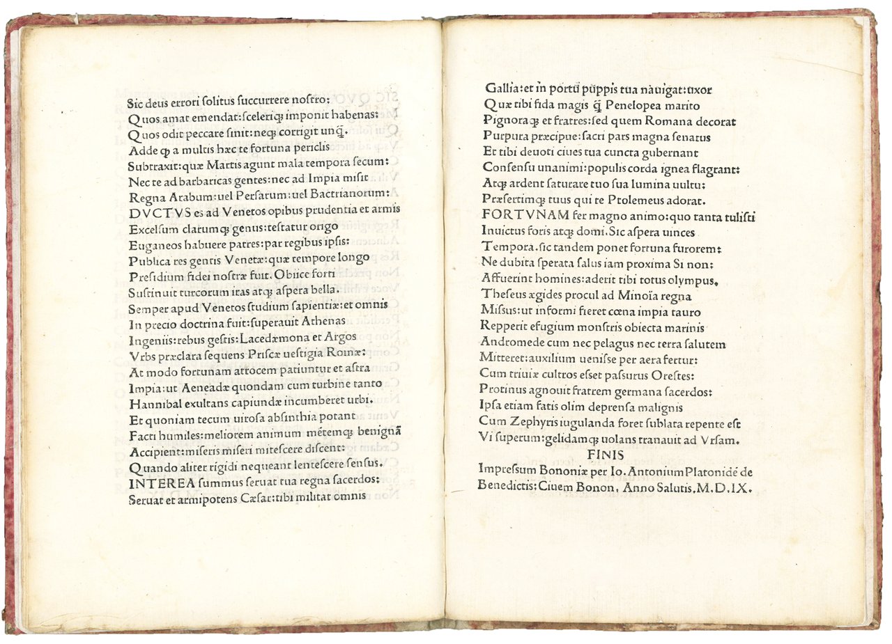 The first edition of this poem was printed by Giovanni Antonio Benedetti under the title De fortuna. F. Mar. Mantuae. The author wrote it to comfort Francesco Gonzaga (1466-1519), the 4th Marquis of Mantua, who was captured by the Venetians on August 9, 1509, while preparing to attack Legnano. The duke remained imprisoned for a year and was released by Pope Julius II. From 1509 to 1510, his wife, Isabella d'Este, held the regency of the duchy. Therefore, the edition was printed after August 1509 (cf. A. Serra-Zanetti, L'arte della stampa in Bologna nel primo ventennio del Cinquecento, Bologna, 1959, p. 186).