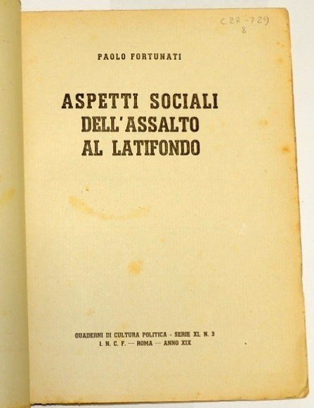 Paolo Fortunati, Aspetti sociali dell'assalto al latifondo, Istituto Nazionale di Cultura Fascista, Roma 1941, pp. 64, cm 23, br. ed. Collana Quaderni di Cultura politica, serie XI, n. 3. Supplemento a Civiltà fascista, n. 9, settembre 1941. Saggio sulla questione agraria in Sicilia. Minimi segni del tempo, per il resto buon esemplare, intonso.