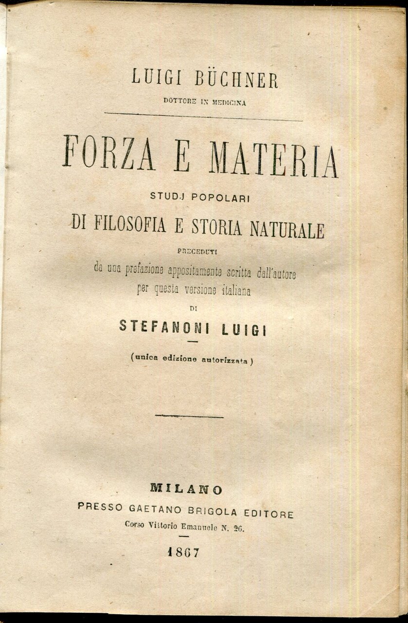 Forza e materia, studi popolari di filosofia e storia naturale preceduti da una prefazione appositamente scritta dall'autore per questa versione italiana di Stefanoni Luigi