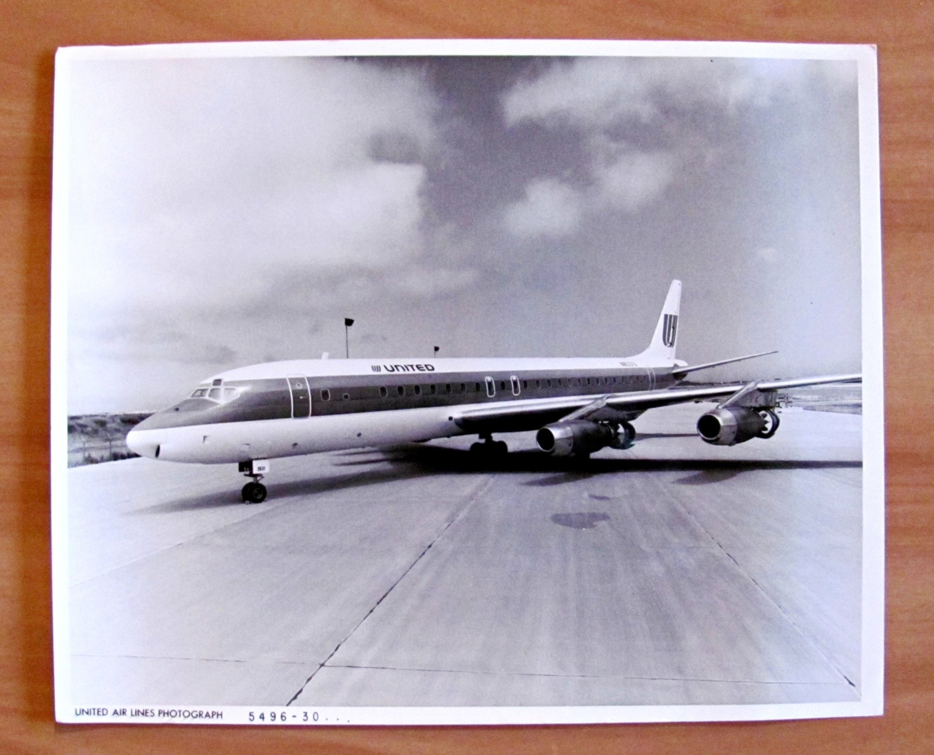Fotografia d'archivio di Aviazione. Aereo United Air Lines. Modello Aereo DC-8. S.d. anni '70/'90 (il logo è quello in uso dal 1974 al 1993). Fotografia d'archivio con piccolo timbro in basso e tracce di vecchia colla al retro. 25,5x20,5. RARA e in OTTIMO STATO , Ottimo (Fine)