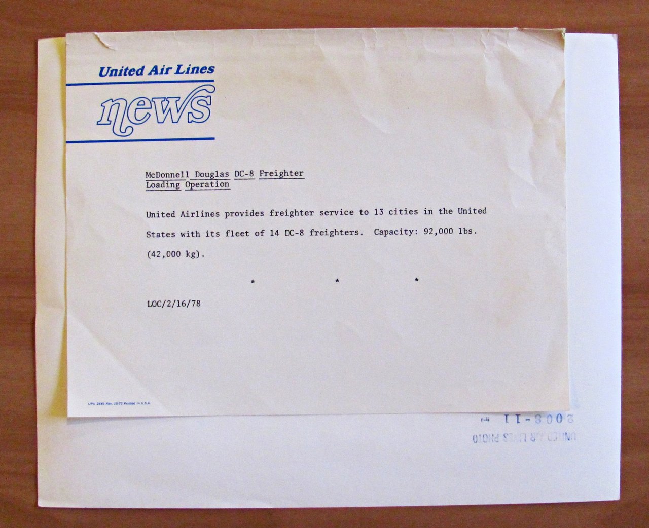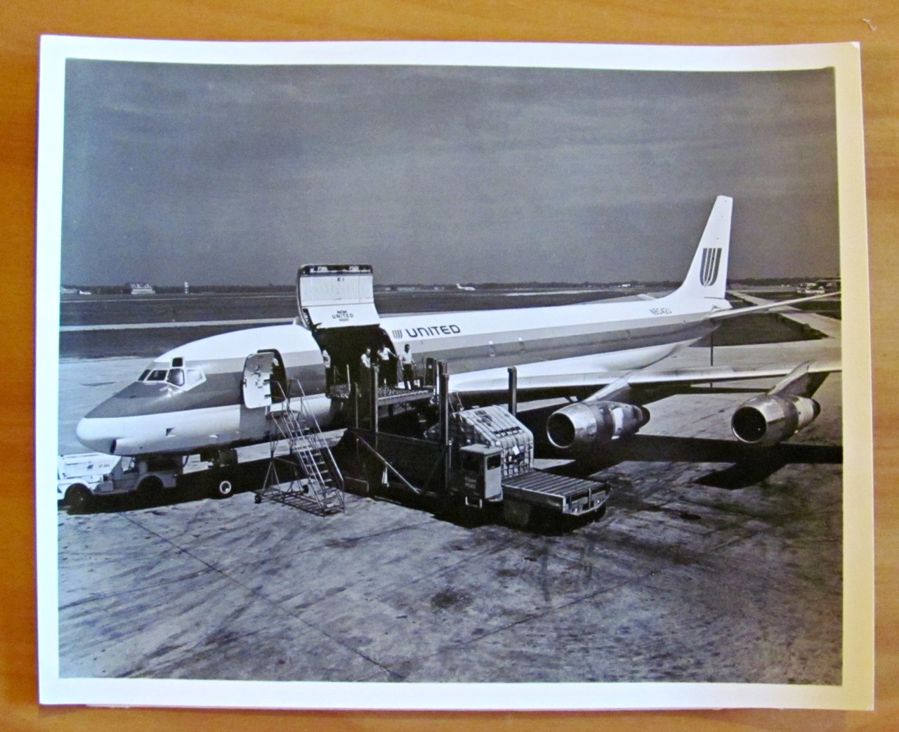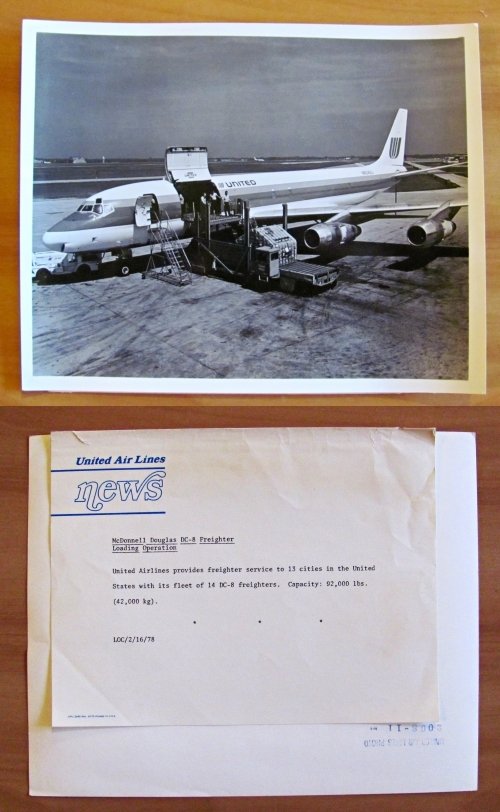 Fotografia d'archivio di Aviazione. Aereo United Air Lines. Modello Aereo DC-8 Freighter. 1978. Fotografia d'archivio con didascalia descrittiva e timbro sul retro. 25,5x20,5. RARA e in OTTIMO STATO , Ottimo (Fine)