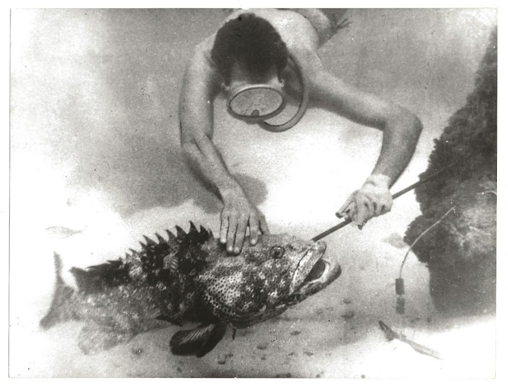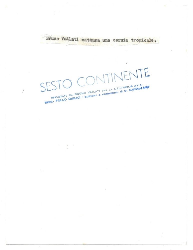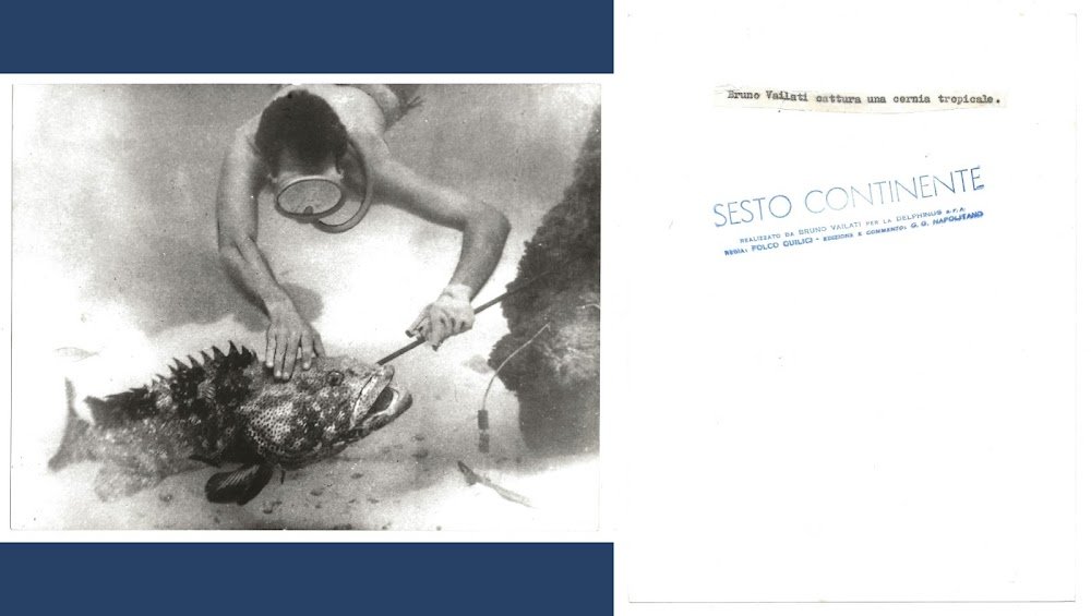Bruno Vailati cattura una Cernia tropicale . Foto originale per Sesto Continente realizzato da Bruno Vailati per la Delphinus SpA. Regia: Folco Quilici - Edizione e commento di G. G. Napolitano. 18x24. Rara e in Stato di Nuovo.