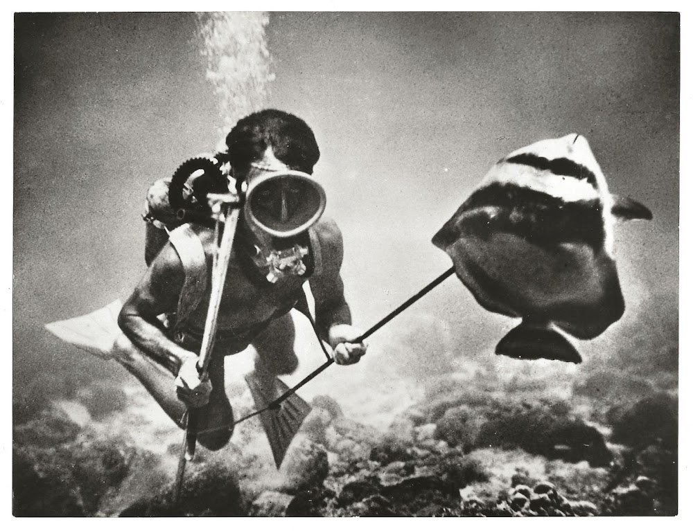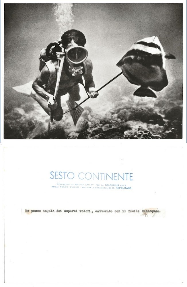 Un Pesce Angelo dai superbi colori, catturato con il fucile subacqueo. Foto originale per Sesto Continente realizzato da Bruno Vailati per la Delphinus SpA. Regia: Folco Quilici - Edizione e commento di G. G. Napolitano. 18x24. Rara e in Stato di Nuovo.