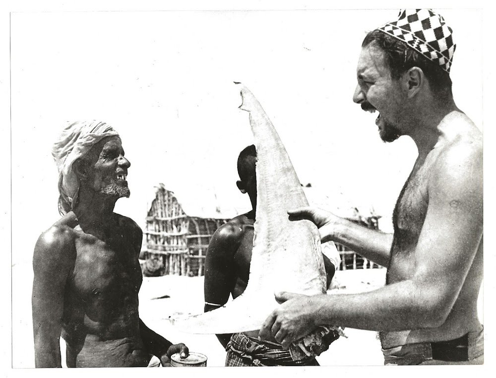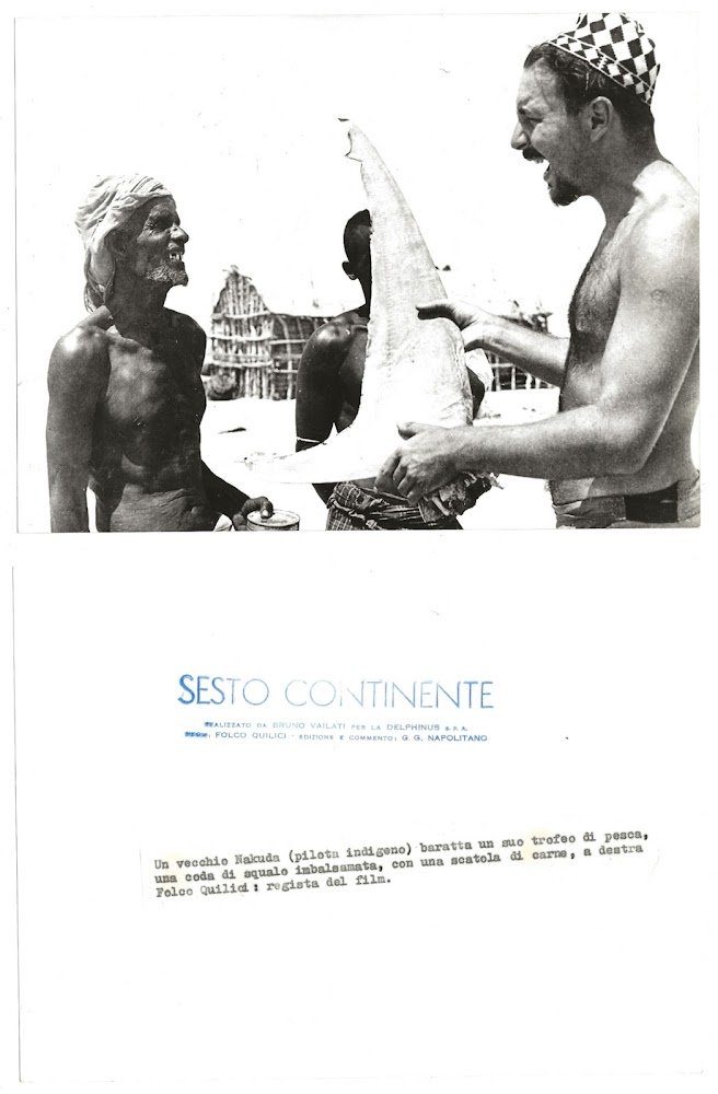 Un vecchio Nakuda (pilota indigeno) baratta un suo trofeo di pesca, una coda di squalo imbalsamata, con una scatola di carne, a destra Folco Quilici: regista del Film. Foto originale per Sesto Continente realizzato da Bruno Vailati per la Delphinus SpA. Regia: Folco Quilici - Edizione e commento di G. G. Napolitano. 18x24. Rara e in Stato di Nuovo.