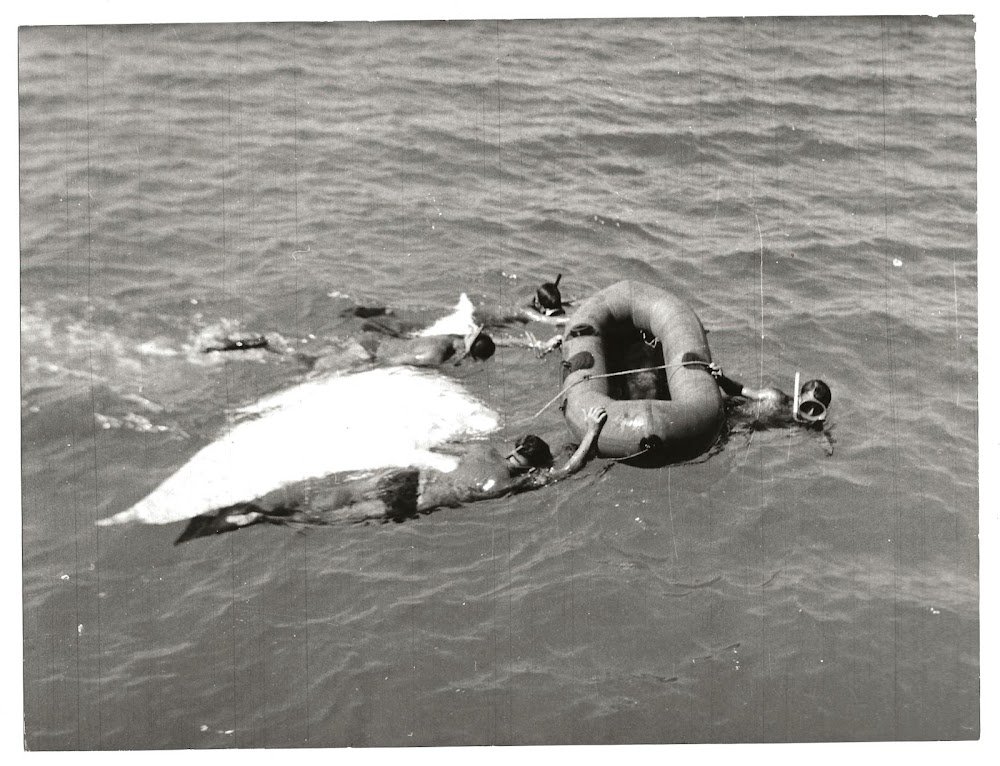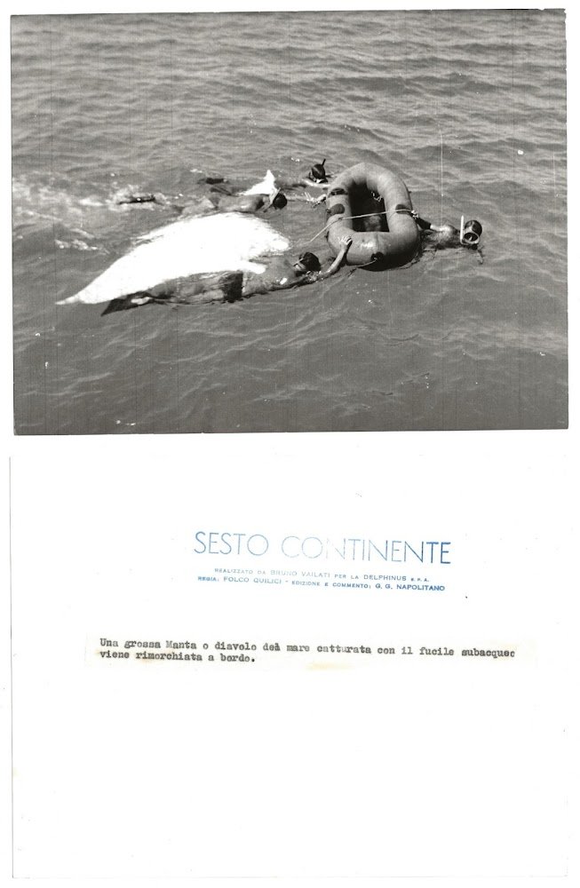 Una grossa Manta o Diavolo del mare catturata con il fucile subacqueo viene rimorchiata a a bordo. Foto originale per Sesto Continente realizzato da Bruno Vailati per la Delphinus SpA. Regia: Folco Quilici - Edizione e commento di G. G. Napolitano. 18x24. Rara e in Stato di Nuovo.