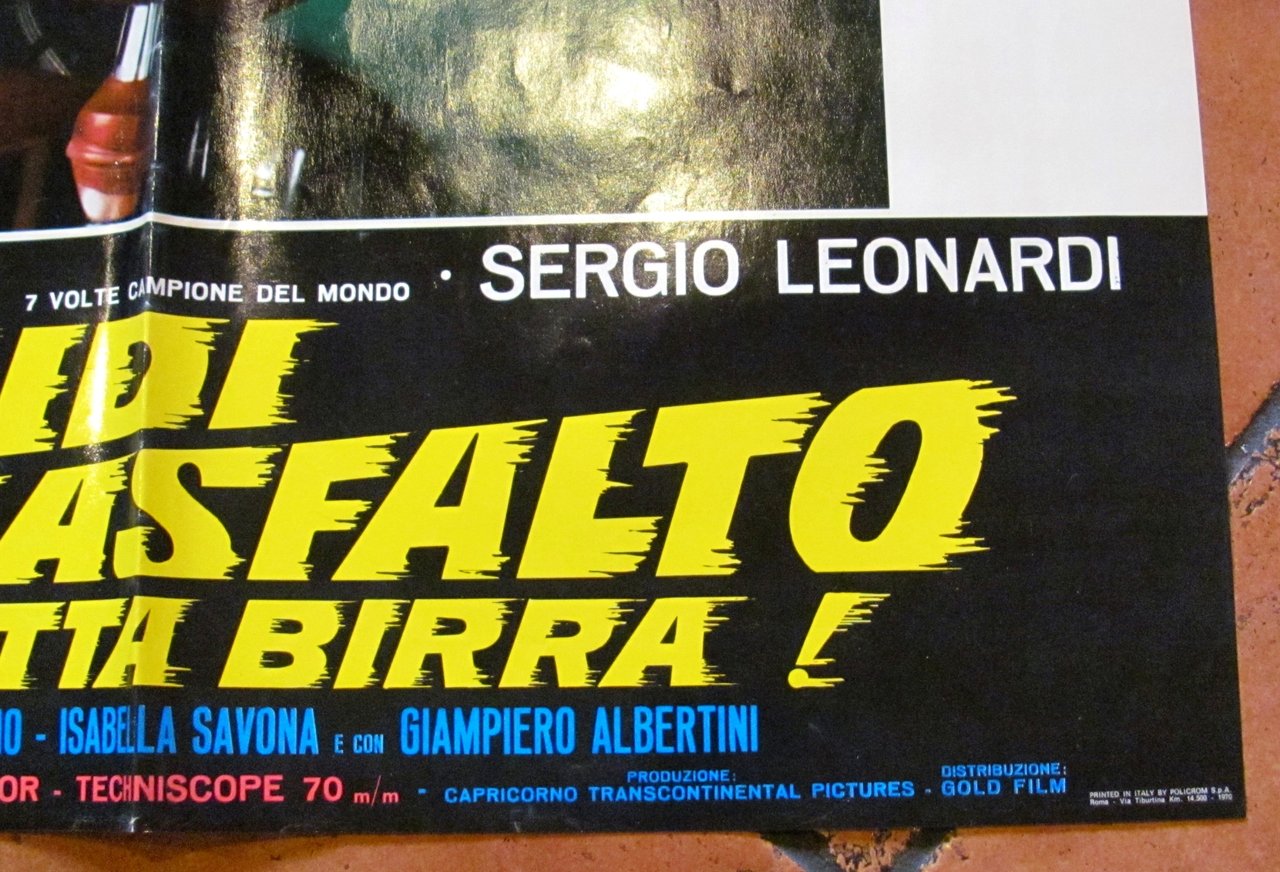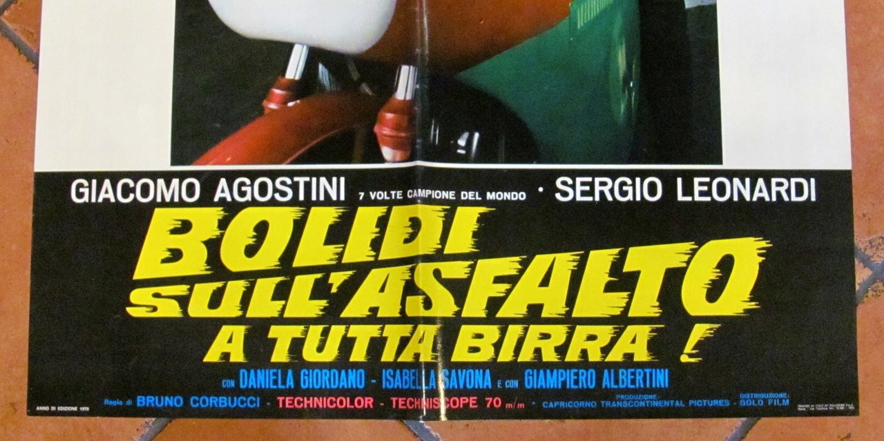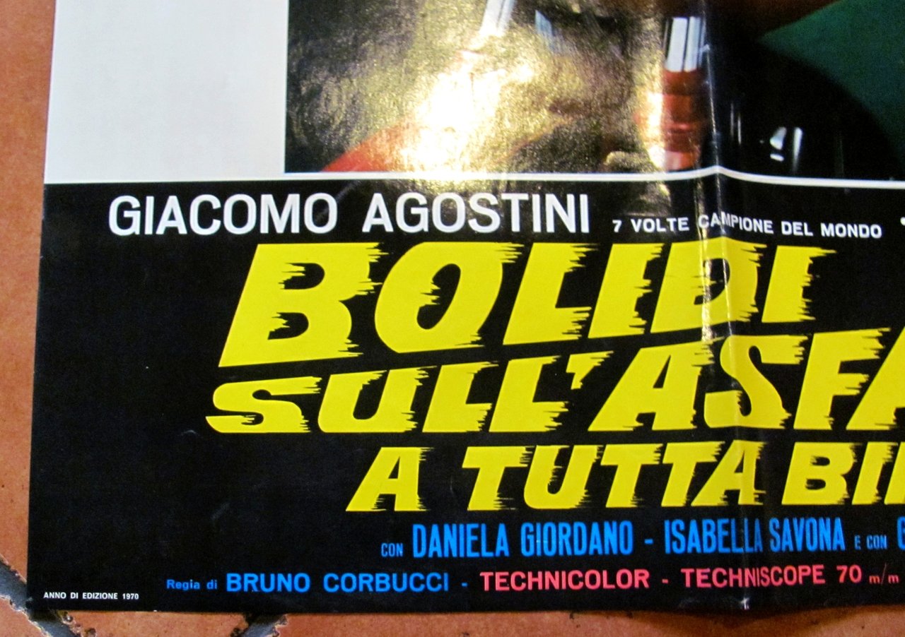 Fotobusta Originale Cinema con Giacomo Agostini (7 volte Campione del Mondo) e Sergio Leonardi. Bolidi sull'asfaltoa tutta birra! Technicolor - Techniscope, edizione 1970. Regia di Bruno Corbucci. Fotobusta 67x96 con minima imperfezione al margine alto (come da foto). Ottimo stato. , Ottimo (Fine)