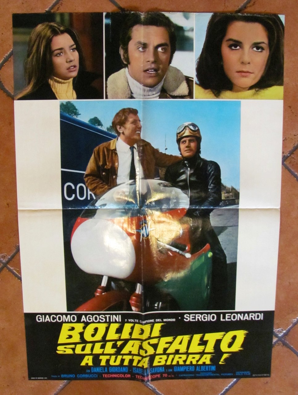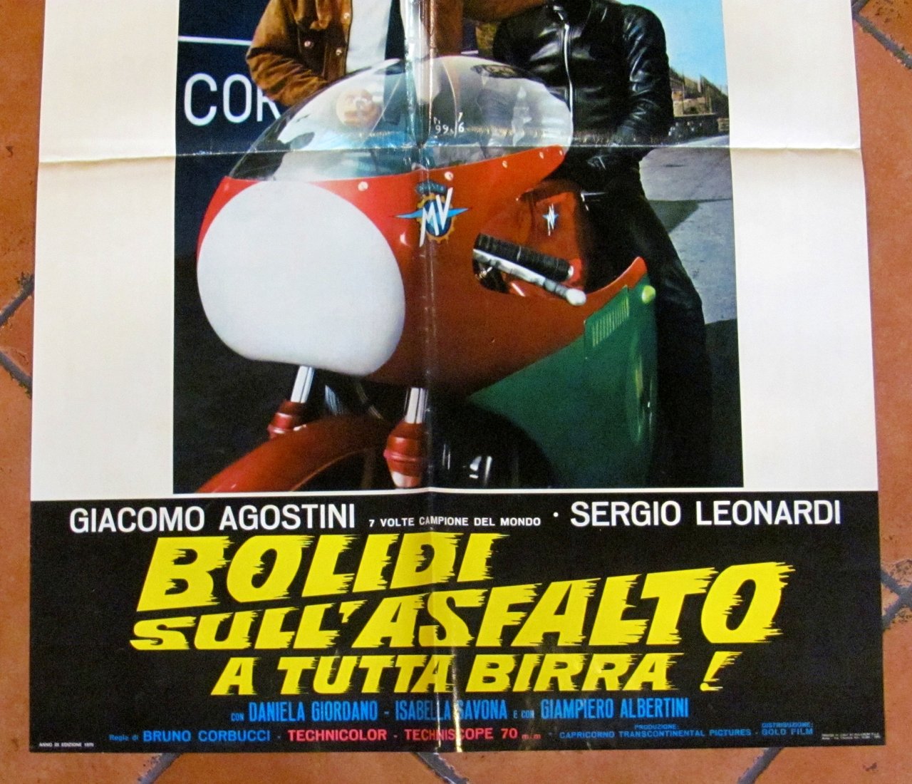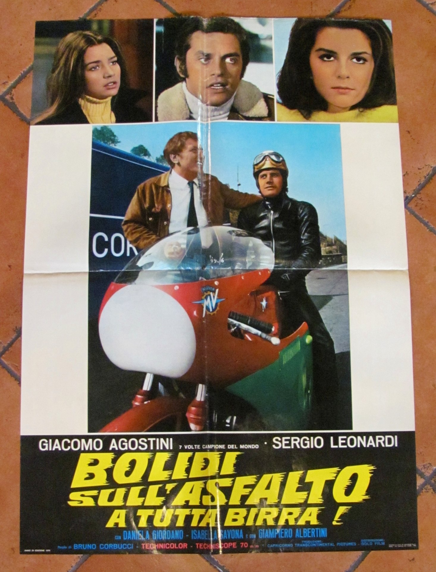 Fotobusta Originale Cinema con Giacomo Agostini (7 volte Campione del Mondo) e Sergio Leonardi. Bolidi sull'asfaltoa tutta birra! Technicolor - Techniscope, edizione 1970. Regia di Bruno Corbucci. Fotobusta 67x96 con minima imperfezione al margine alto (come da foto). Ottimo stato. , Ottimo (Fine)