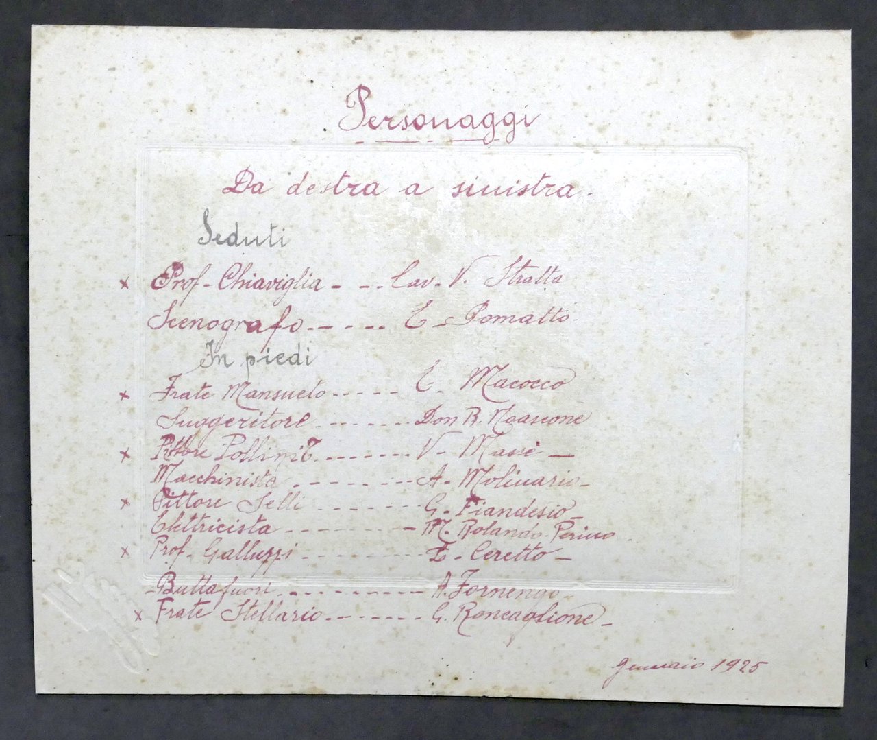 Fotografia Rappresentazione Teatrale Circolo Virtus in Fide - Cuorgnè - Dramma in tre atti Mattutino di P. Barbagallo - 1925 Dimensioni: 13 x 18 cm ca. Foto applicata su cartoncino rigido (21 x 25 cm ca.) Buone condizioni generali.