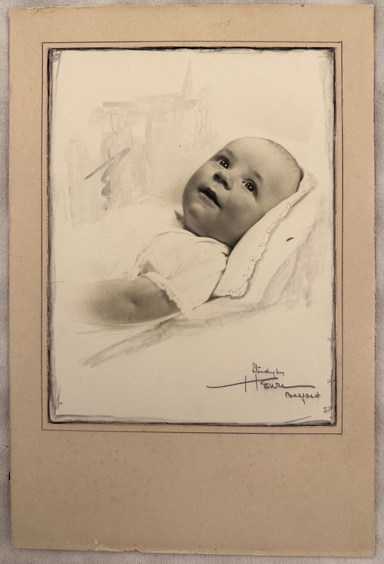 Fotografia di un bambino ritoccata a matita montata su passepartout. Senza data ma di fine ottocento. Dedica al Dr. James Dunlop (1842-1898) medico chirurgo da campo appartenente al nono Reggimento di Cavalleria. Dim. passepartout cm 30,5x20,5 Dim. Foto cm 21x16. Hoto of a child repainted in pencil mounted on passepartout. Not dated but of late 19th century. Dedication to Dr. James Dunlop (1842-1898) street surgeon belonging to the 9th chevalry regiment. Dim. passepartout cm 30,5x20,5 Dim. Foto cm 21x16