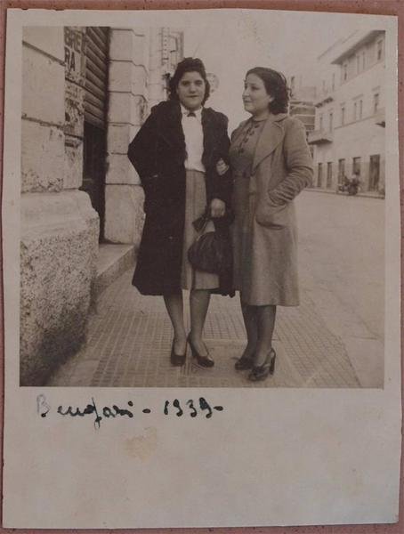 Bella fotografia del 1939 che rappresenta due donne italiane a Bengasi. Antica nota manoscritta. In buone condizioni. Mende. Dim. cm 8x6. Very beautiful photography of 1939 representing two italian women in Bengasi. Manuscripted note In good conditions.