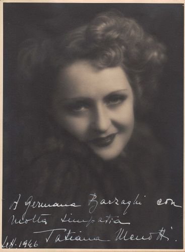 Bel ritratto fotografico in b/n di cm 23 x 17, applicato ad un cartoncino solo al retro del margine superiore. Tatiana Menotti (Boston, 1909 - Barcellona, 2001) è stata un soprano italiano. Per venticinque anni è stata uno dei prinipali artisti de La Scala.