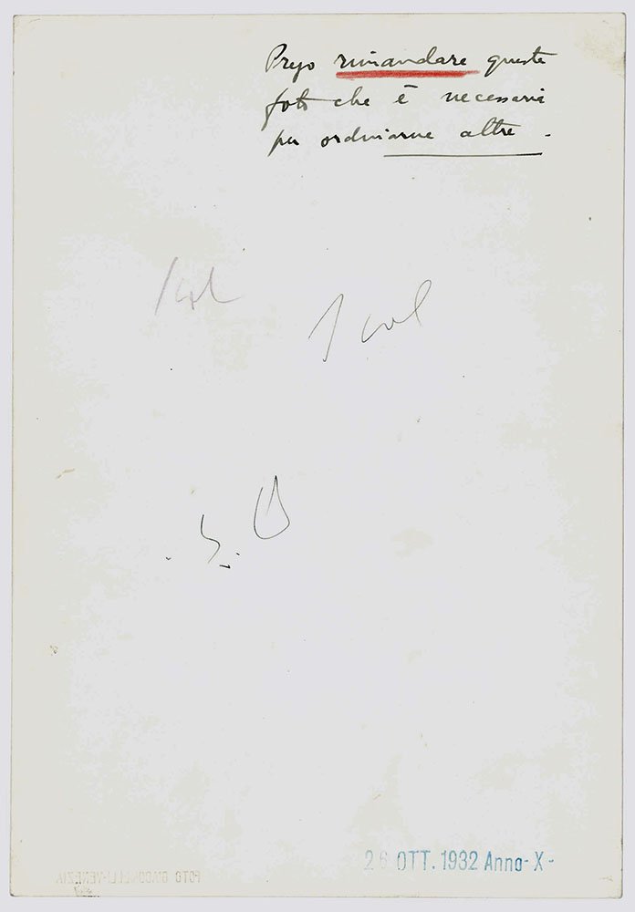FOTOGRAFIAStampa fotografica vintage.CON AUTOGRAFO.Iscrizione autografa dell’artista verso. Data da timbro blu verso. Timbro a secco del fotografo recto.Minime tracce di sporco recto, complessivamente in ottime condizioni; proveniente dall’archivio del futurista B.G. Sanzin.Rara fotografia originale in formato grande.