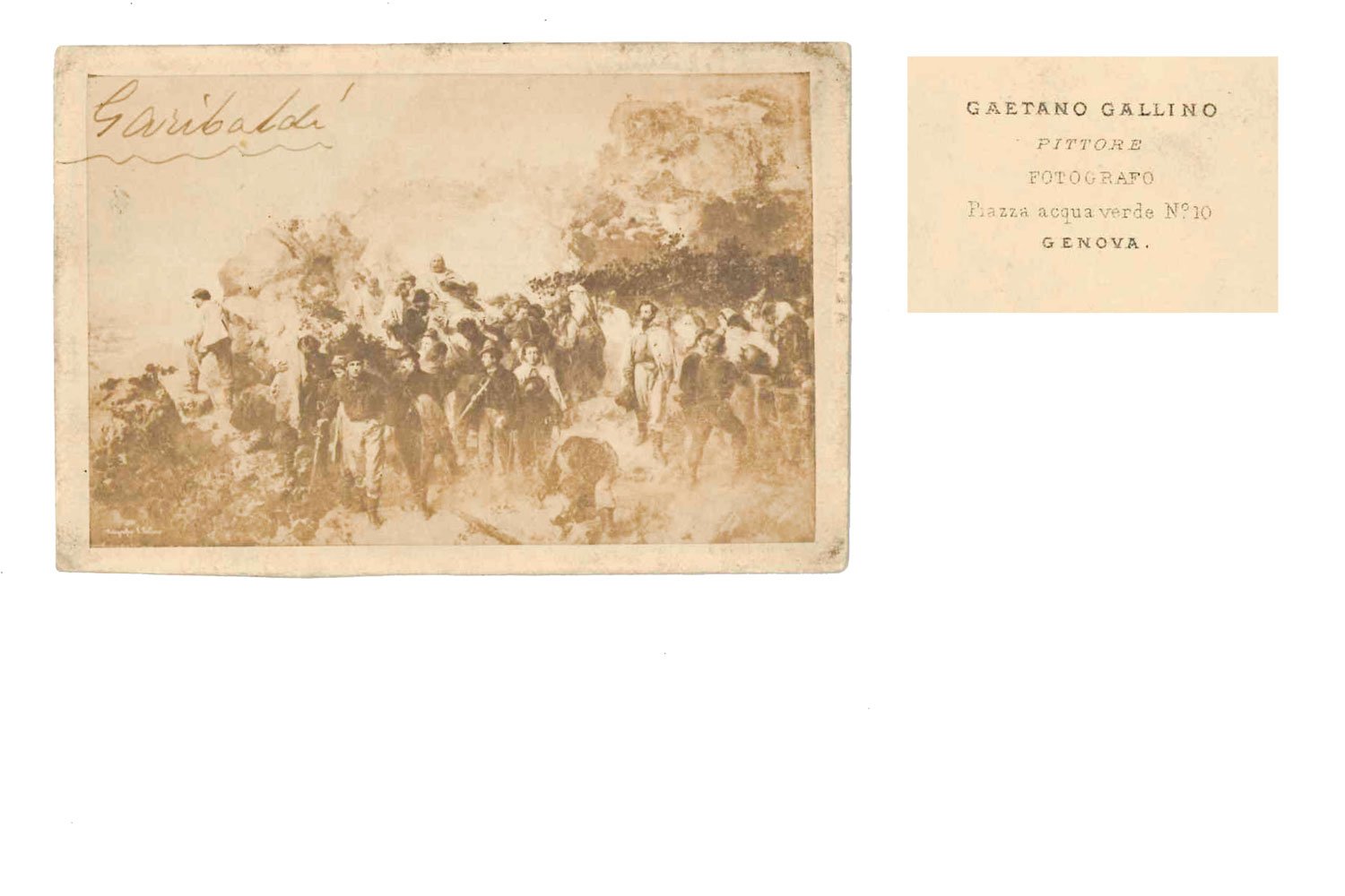 FOTOGRAFIAStampa fotografica vintage eseguita da Gaetano Gallino pittore e fotografo.CON AUTOGRAFO.Esemplare con firma autografa di Giuseppe Garibaldi.Albumina su cartone originale. Formato carte de visite (55x83 mm), supporto (60x90). Fotografia formato visita con firma autografa. Si tratta della foto, opera del pittore fotografo Gaetano Gallino di Genova, di un dipinto raffigurante il generale che viene portato a spalla dai suoi dopo la ferita di Aspromonte.