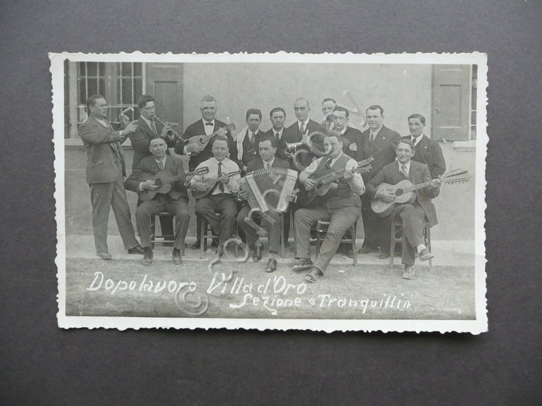 Fotocartolina, † Dopolavoro Villa d'Oro Sezione Tranquilli" S.d. (anni '30 del Novecento), cartolina postale d'epoca con una bella ill. fot. in b/n, non viaggiata, cm 8,5x13,5. Retro con qualche rimovibile annotazione numerica a matita (vedi foto).† † Condizioni di conservazione Esemplare in buono stato con minime tracce d'uso, margini frastagliati, angoli con trascurabili difetti. † Esemplare pressochÈ unico. † SC03.D9810 N "