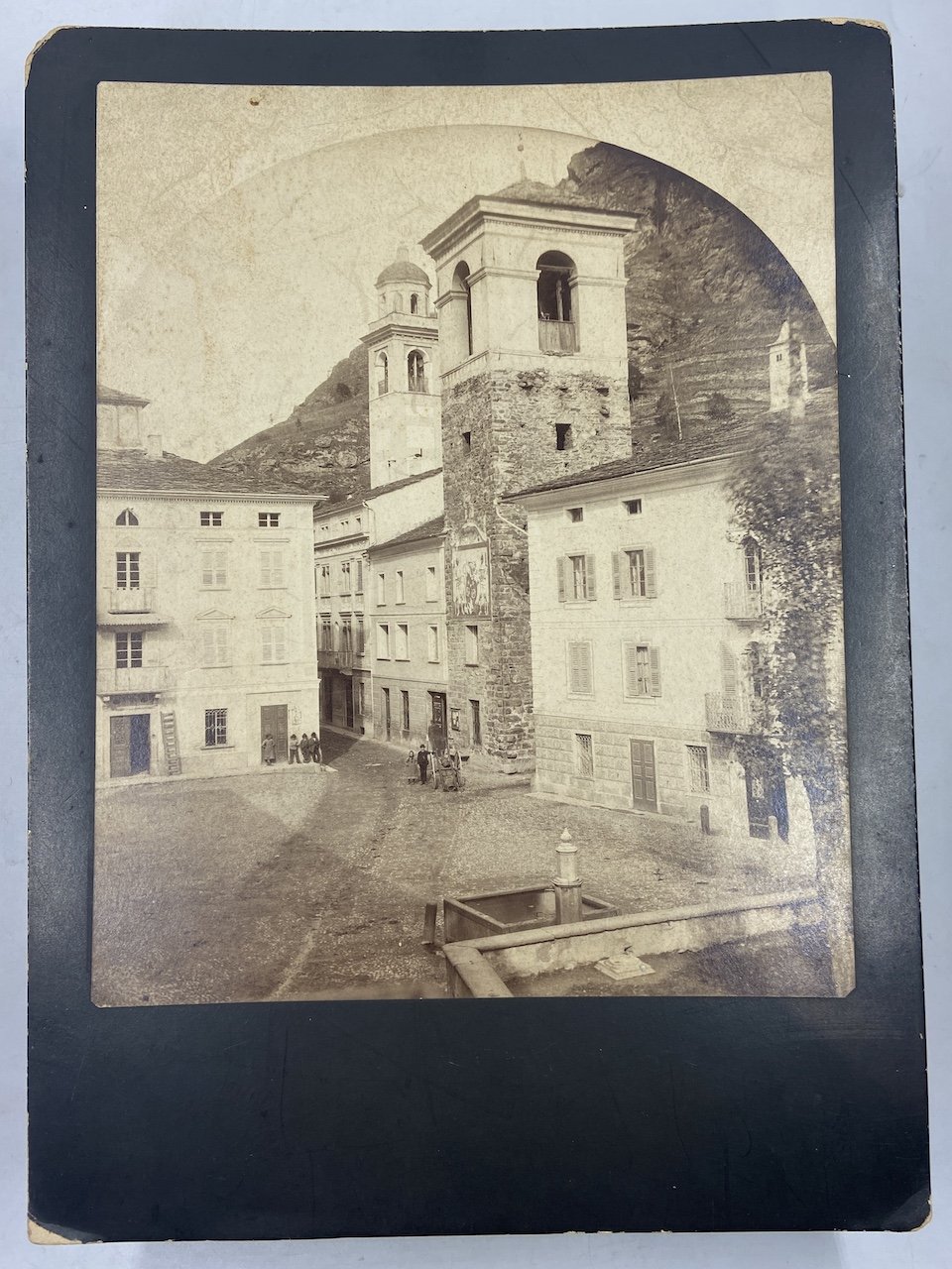 Fotografia all’albumina cm 20x25, montata su cartoncino nero lucido cm 24x33, lievemente incurvato. Rara fotografia della piazza comunale di Poschiavo, comune del Cantone dei Grigioni al confine con la Valtellina; nell’immagine, con medio contrasto e contenuti segni d’usura, alcune figure sostano alla base della torre comunale, sulla quale ancora campeggia un affresco, oggi scomparso, con le insegne della città; alle spalle de “la Tor” si erge il campanile della Chiesa Evangelica.