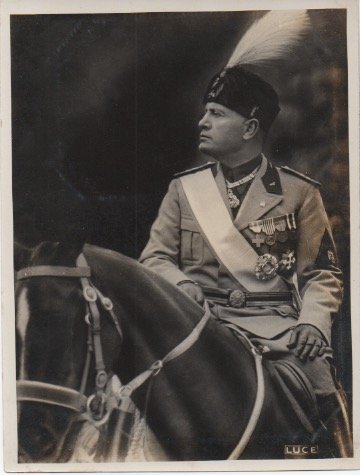 FOTOGRAFIA240x182 mm. Al verso timbro a inchiostro dell'Istituto Nazionale Luce. La fotografia ritrae Mussolini in uniforme a cavallo.