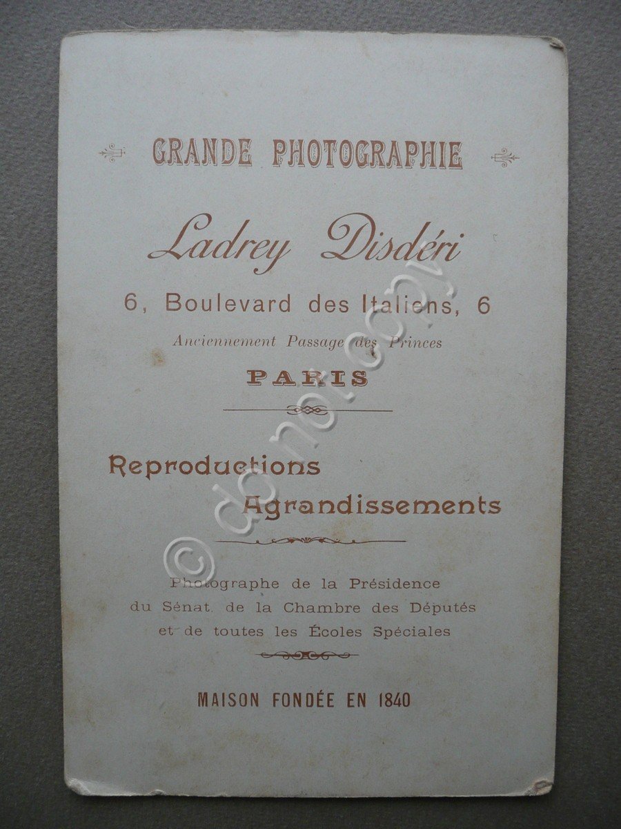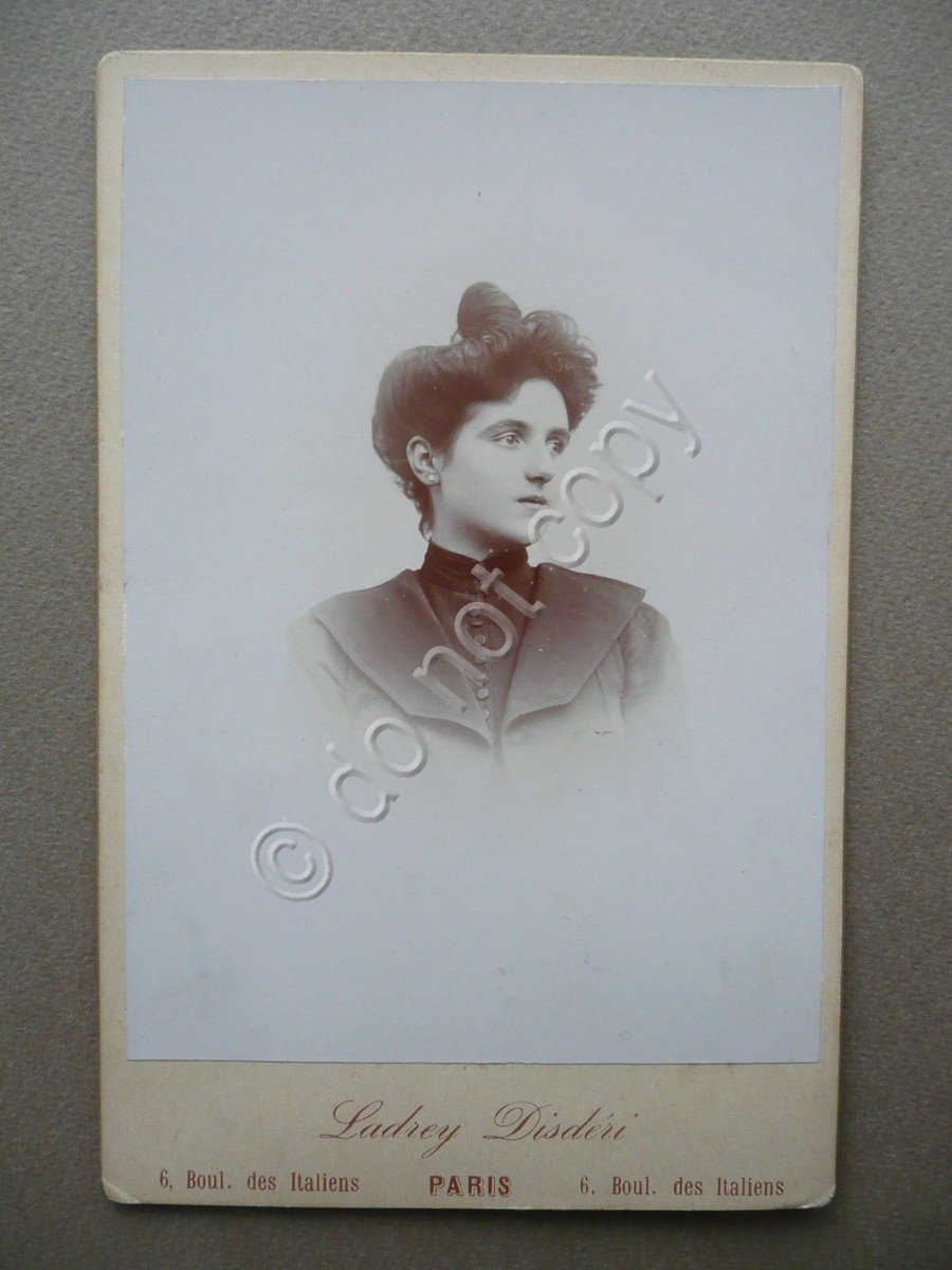 Grande fotografia, Ritratto fotografico femminile foto Ladrey Disdéri 6, Boulevard des Italiens, 6 Anciennement Passage de Princes Paris Foto Ladrey Disdéri, Boulevard des Italiens, Paris, s.d. (1880 circa), ritratto fotografico femminile originale applicato su supporto in cartoncino, al margine inf. e al retro presenza dei dati del fotografo autore dello scatto. Cm 16,5x10,5. Condizioni di conservazione Esemplare in buone condizioni con tracce d'uso, fotografia con minime trascurabili imperfezioni, supporto con qualche minima brunitura, angoli arrotondati e con piccolissimi difetti.