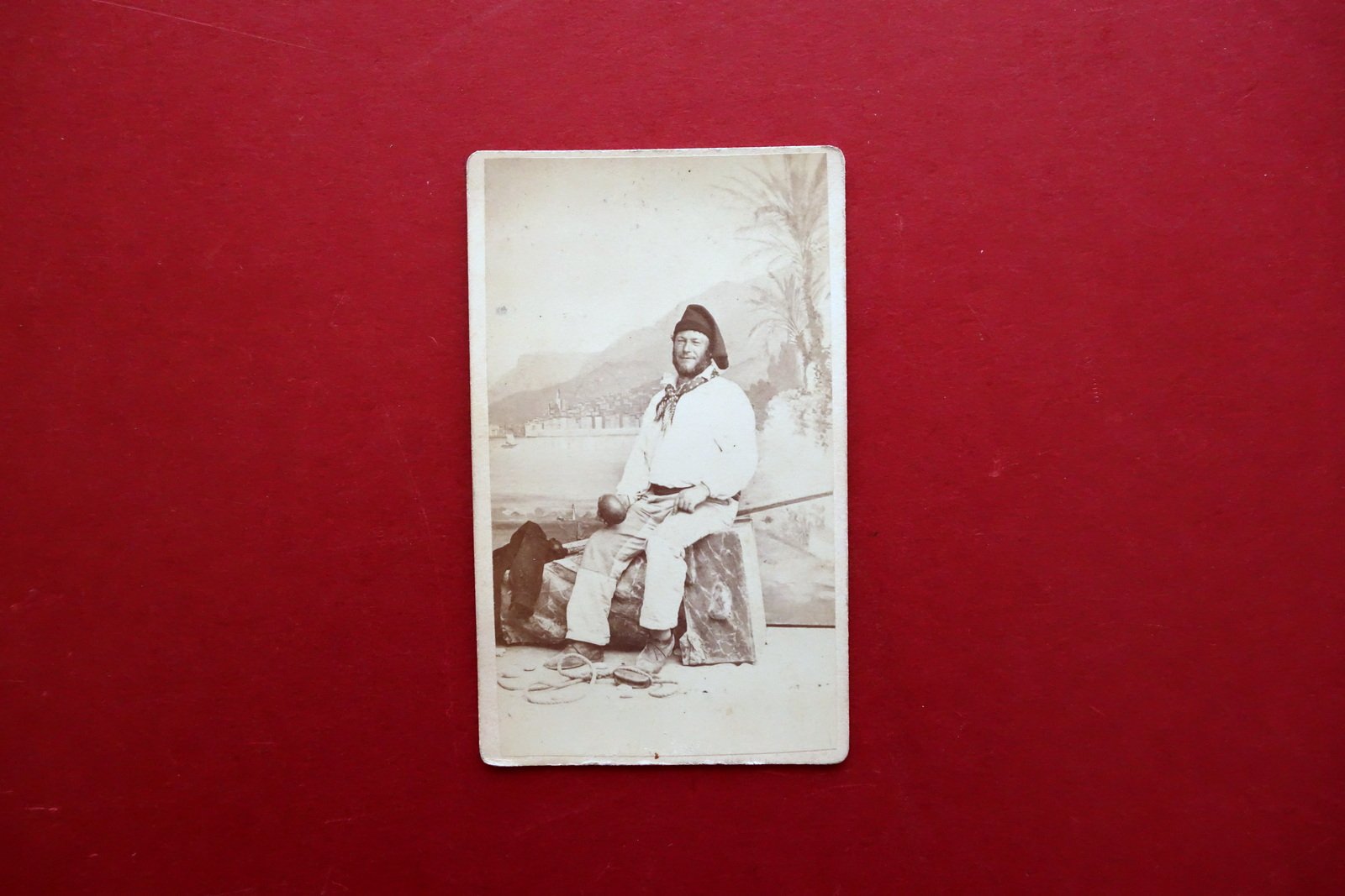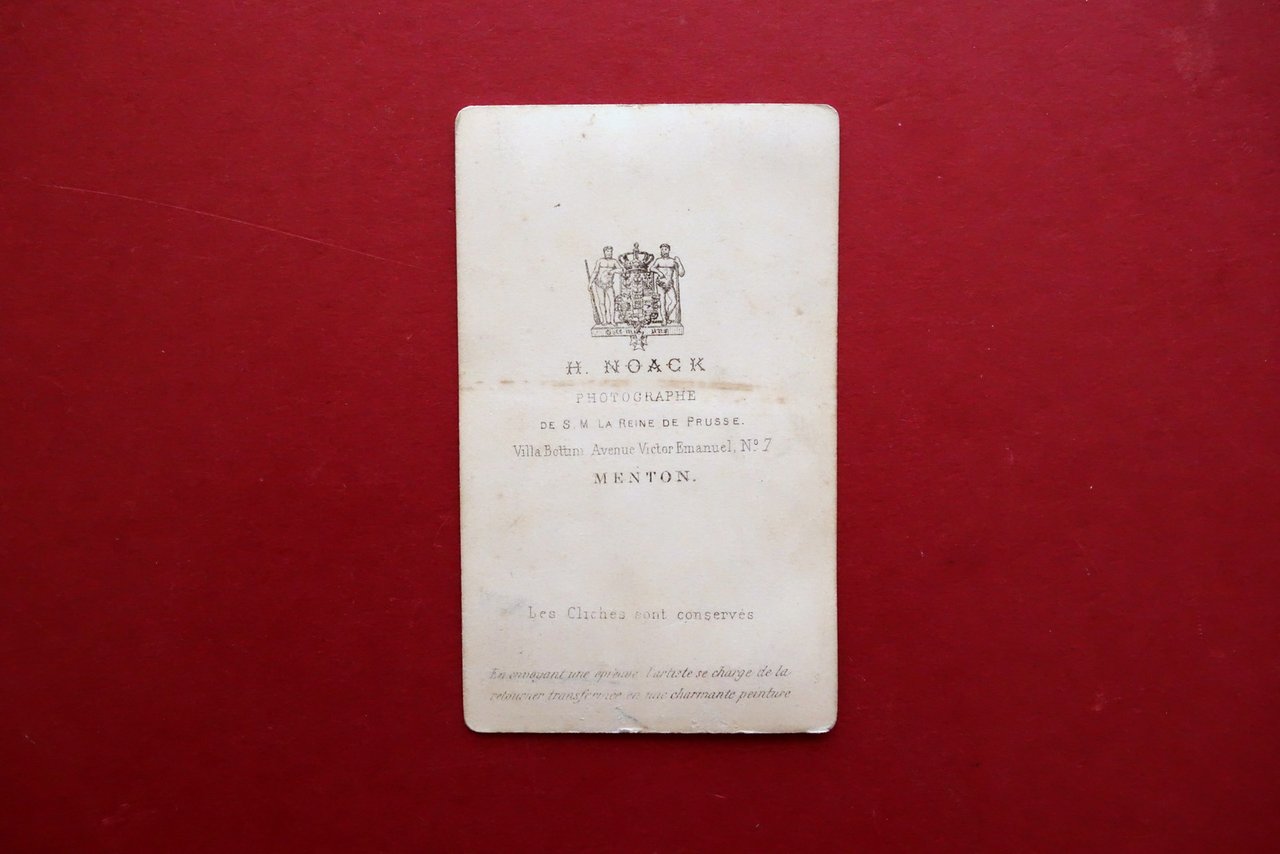 Fotografia originale, Uomo in abiti tradizionali - pescatore? - H. Noack prohographie de S. M. la Reine de Prusse Villa Bottini - Avenue Victor Emanuel 7 Mentone metà Ottocento circa H. Noack photographe, Mentone, s. d. ma metà Ottocento circa; fotografia originale applicata su supporto in cartoncino; al retro del supporto dati a stampa del fotografo (vedi foto). Formato carte de visite. Cm 10,5x6,5. Condizioni di conservazione Buone condizioni con lievi segni del tempo, angoli del supporto in cartoncino leggermente arrotondati, alcune minuscole bruniture e aloni. Per ulteriori dettagli vedi foto. SC03.D18833 N