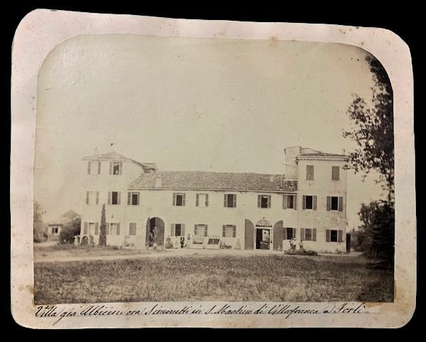 21,5x6,5 cm il foglio; fotografia della seconda metà del XIX° secolo applicata su carta ottocentesca e con una nota coeva al margine basso, manoscritta che descrive il titolo la fotografia. Bellissima fotografia, scattata da anonimo fotografo, di questa bella villa a San Martino di Villafranca in provincia di Forlì appartenuta prima prima ai Simonetti (Conti) e poi agli Albicini, proprietari del complesso al momentodella scotta della fotografia. Alcuni personaggi, in tipici costumi ottocenteschi si possono vedere, posizionati davanti alla villa. Rarità.