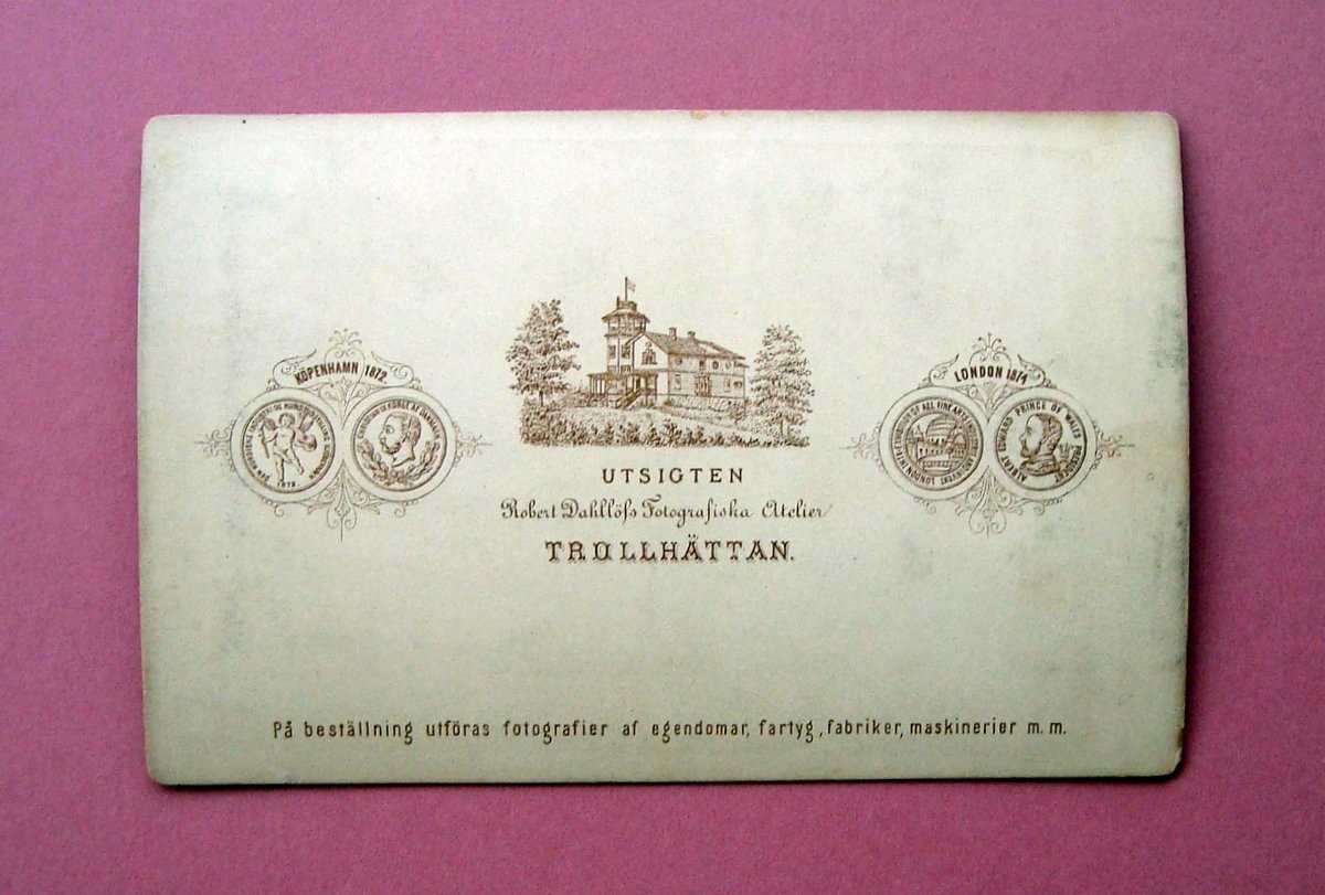 Fotografia, TROLLHATTAN Atelier Fotografisha Robert Dahllofs, 1875 ca; cm 11x16,5; fotografia bianco e nero su supporto di cartoncino rigido ad angoli arrotondati; al retro nome del fotografo e disegno in bella grafica (vedi foto). Condizioni di conservazione. Esemplare in buone condizioni con tracce del tempo, leggere bruniture e minuscole abrasioni; per maggiori dettagli vedi foto. SC03.D16675 BLU