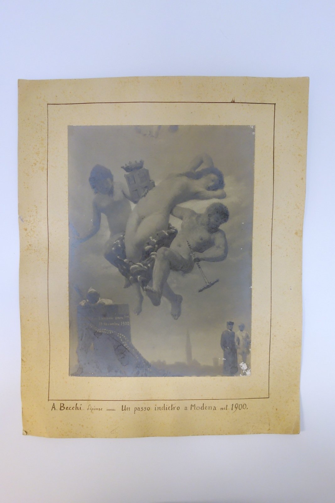 Premiata Fotografia Artistica G. Vivi, Modena, s. d. ma primi del '900; grande fotografia originale in b/n, applicata su supporto in cartoncino; al margine inferiore del cartoncino di supporto è stata annotata a mano la didascalia A. Becchi dipinse - un passo indietro a Modena nel 1900. Trattasi molto probabilmente di fotografia d'epoca dell'omonimo dipinto del Becchi. Al retro del supporto dati del fotografo. Dimensioni: cm 40,5x32,5 (supporto); cm 28,5x21 (fotografia).