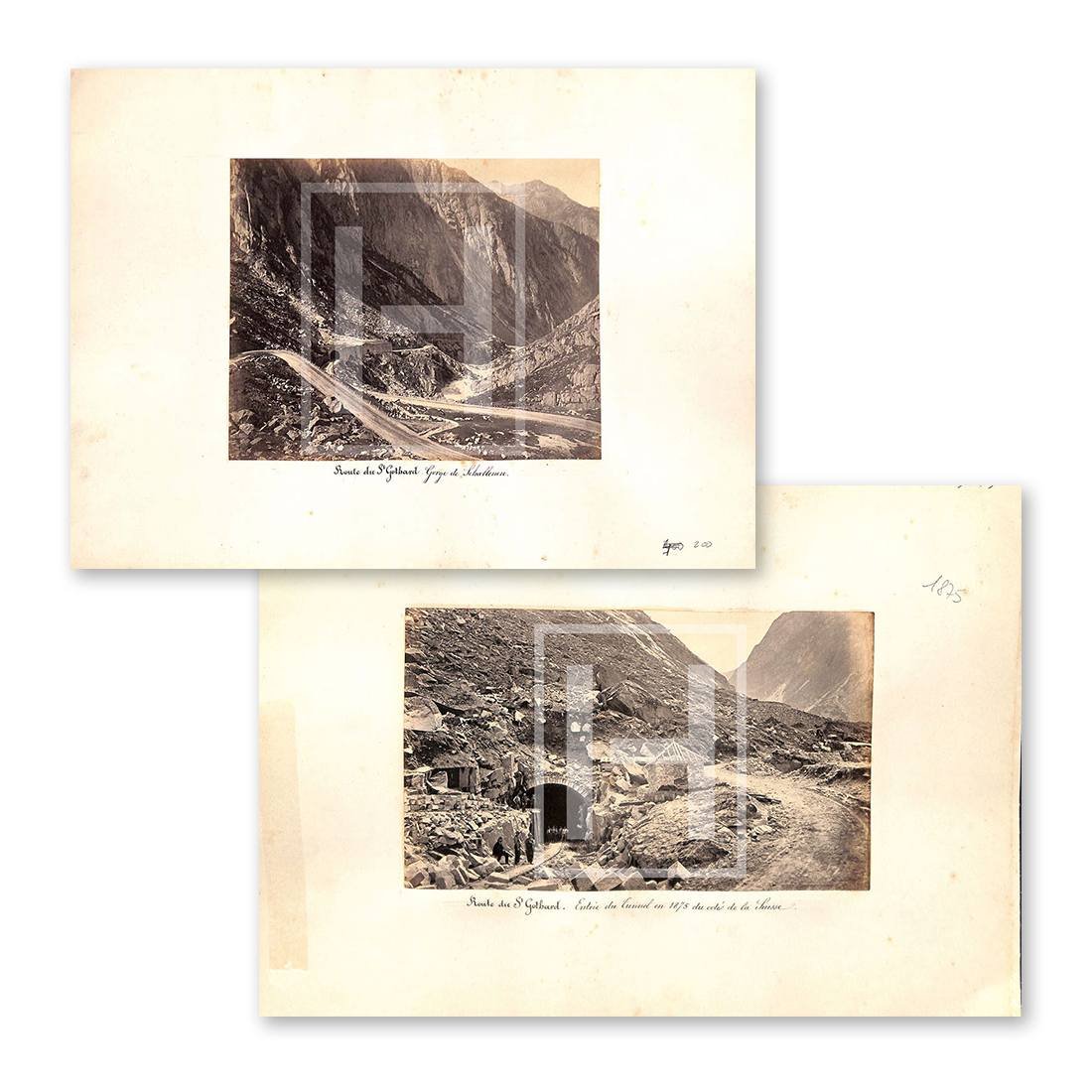 Foto originali su unico cartoncino (fronte e retro) Fronte: Strada del Gottardo fine '800 Retro: Costruzione della galleria anno 1875 Dimensioni: cartoncino: 36,9 x 27 cm; netto fotografie: (Fronte) 16 x 19 cm; (retro) 13,8 x 22,3 cm Stato di conservazione come da foto