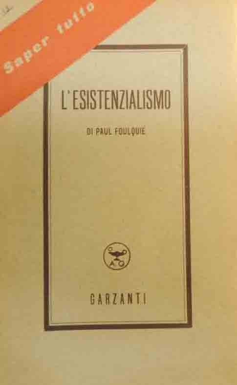 Paul Foulquié, L’esistenzialismo, Garzanti, Milano 1951, pp. 110, cm 19, br. ed. Collana Saper tutto, n. 13. Titolo originale dell’opera: L’existenzialisme. Traduzione dal francese di Roberto Ortolani. Data manoscritta all’occhiello, minimi segni del tempo, per il resto ben conservato.