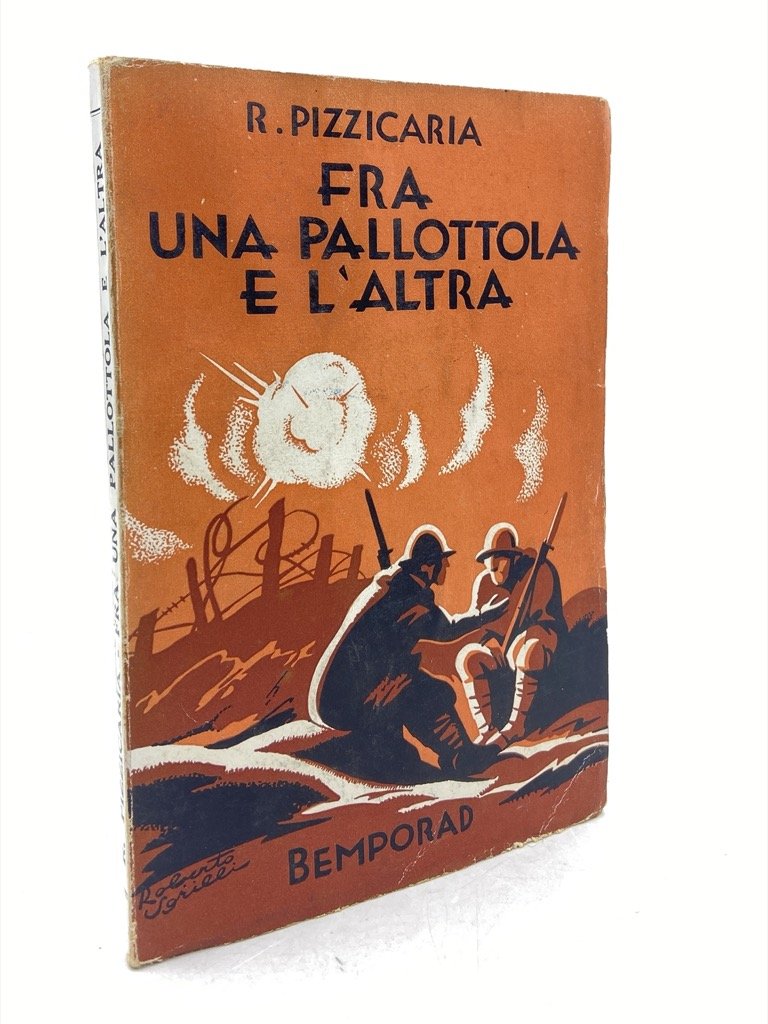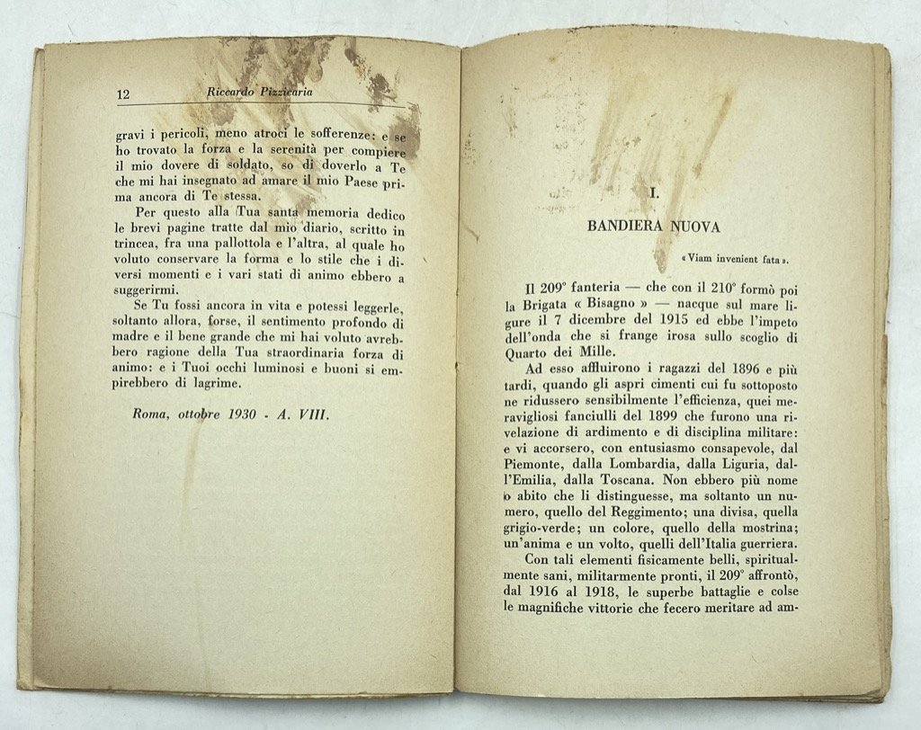 Brossura editoriale illustrata, cm 19.5 x 13, pp 102 (2). Macchie che non impediscono la lettura sulle pagine 12 e 13, legatura lievemente allentata, peraltro in buono stato. Diario della Grande Guerra del pluridecorato Riccardo Pizzicaria, in servizio presso il 209 Reggimento Fanteria (poi confluito nella Brigata Bisagno), dal maggio 1916 al 4 novembre 1918: Monte Ciove, Monte Cimone, altopiano di Asiago, Carso, Tagliamento, Piave. Prefazione di Amilcare Rossi, copertina dell’illustratore fiorentino Roberto Sgrilli (1897 - 1985). Esemplare impreziosito da un invio autografo dell’autore sull’occhietto.