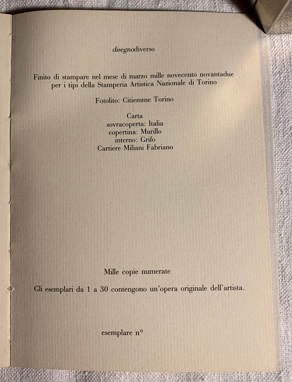 I ed. limitata a mille copie numerate. Gli esemplari da 1 a 30 contengono un'opera originale dell'artista (esemplare non numerato, senza opera originale dell'artista. Finito di stampare nel mese di marzo mille novecento novantadue). Collana a cura di Paola Gribaudo disegnodiverso. XVI/ (64) in carta Grifo/ brossura in carta Murillo / sovraccoperta in carta Italia . Illustrazioni a colori. Stato buono.