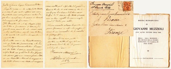 lettera manoscritta e firmata di Francesco Muzzioli di 2 facciate datata Modena, 16 Dicembre 1894; ottimo es.; alla lettera verrà allegato il fascicoletto "Mostra retrospettiva di Giovanni Muzzioli con altri pittori ell'800 nella Sala Mussolini del Circolo della Stampa a Bologna dal 9 al 23 maggio 1937" in mediocre stato