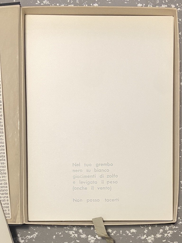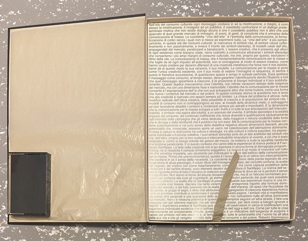 Cofanetto muto in tela nera, cm 35 x 25.5, contenente l’opera in 26 cartoncini sciolti serigrafati a mano e protetti da veline, e una musicassetta. Raccolta di poesie di Francesco Sanfilippo in edizione ideata e serigrafata dall’artista Renaldo Nuzzolese (Taranto 1918 - Torino 1988), attivo nella scena dell’avanguardia torinese dagli anni ’60 come fondatore del Gruppo Sperimentale d’Arte e dell’Operativo Ti.Zero e collaboratore di Geiger di Adriano Spatola. L’opera è impressa in serigrafia su cartoncini sciolti e comprende un testo critico di Roberto Giammanco (su cartoncino patinato), due «brossure» in cartoncino nero, il testo grigio argento su fogli bianchi protetti da velina, e un colophon, firmato da Nuzzolese, su due cartoncini grigi. Invio autografo dell'autore sul primo foglio bianco. Presente, in custodia applicata al contropiatto del cofanetto, l'allegata musicassetta. Tiratura di 100 esemplari numerati, prima edizione.