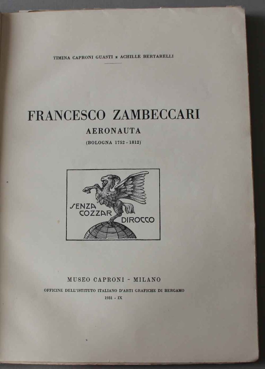 <p>35 cm, cartonatura editoriale, titolo al piatto e dorso e ritratto del Zambeccari applicato al piatto. p. xiv, 124; 24 tavole protette da velina e 19 ill. Tiratura di 500 esemplari fuori commercio e 100 in vendita</p>