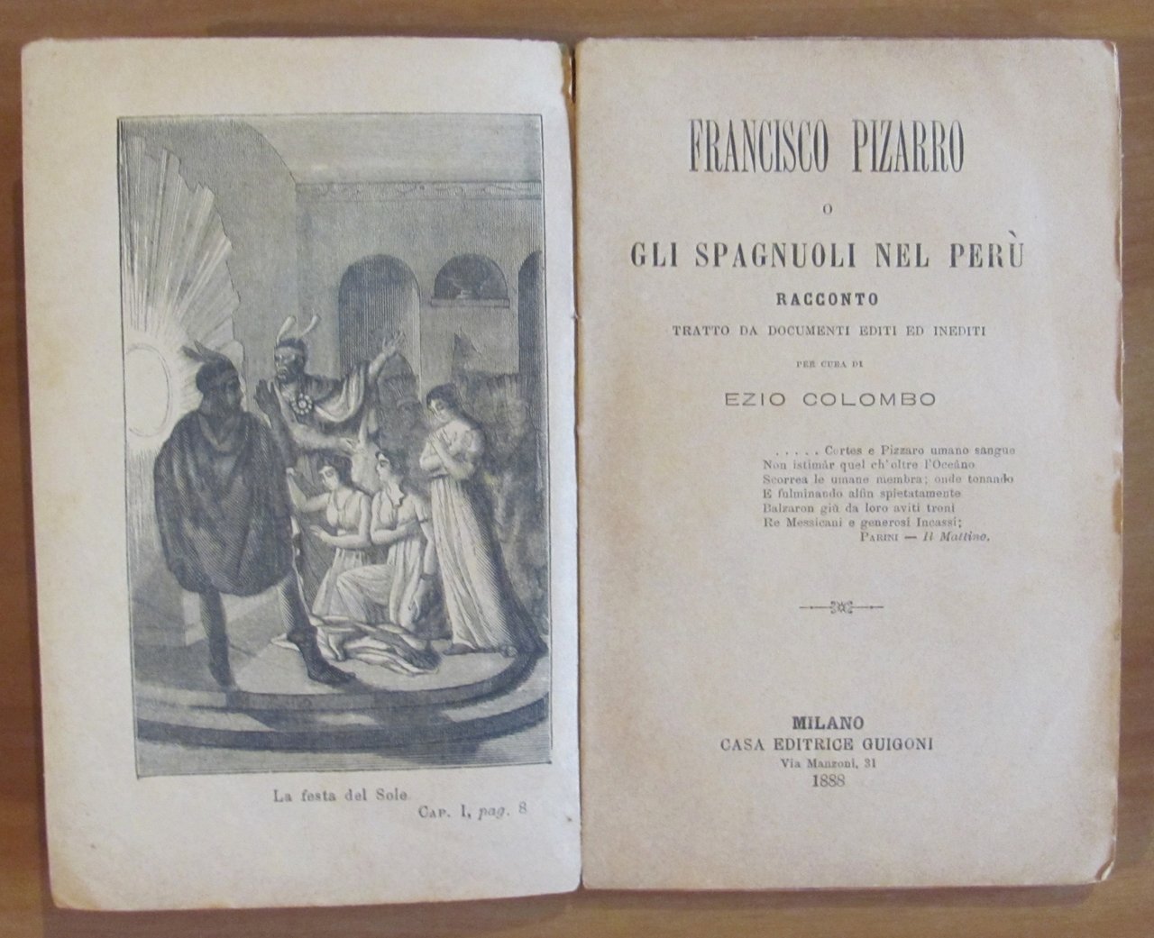 Francisco Pizzarro o gli spagnuoli nel Perù. Racconto tratto da documenti editi ed inediti. Volume Unico. 2 tavole in b/n a piena pagina. Casa Editrice Guigoni - Milano, 1888. Brossura editoriale con leggerissime imperfezioni del tempo. 10,5x16; pp.103. Raro e in Ottimo stato. , Ottimo (Fine)