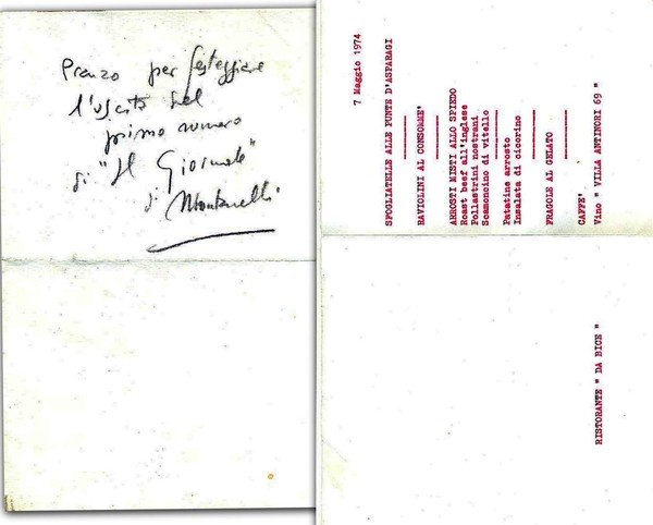 Franco Berutti. Menù con la calligrafia di Franco Berutti per festeggiare l'uscita del Giornale. Giornalista e critico cinematografico.