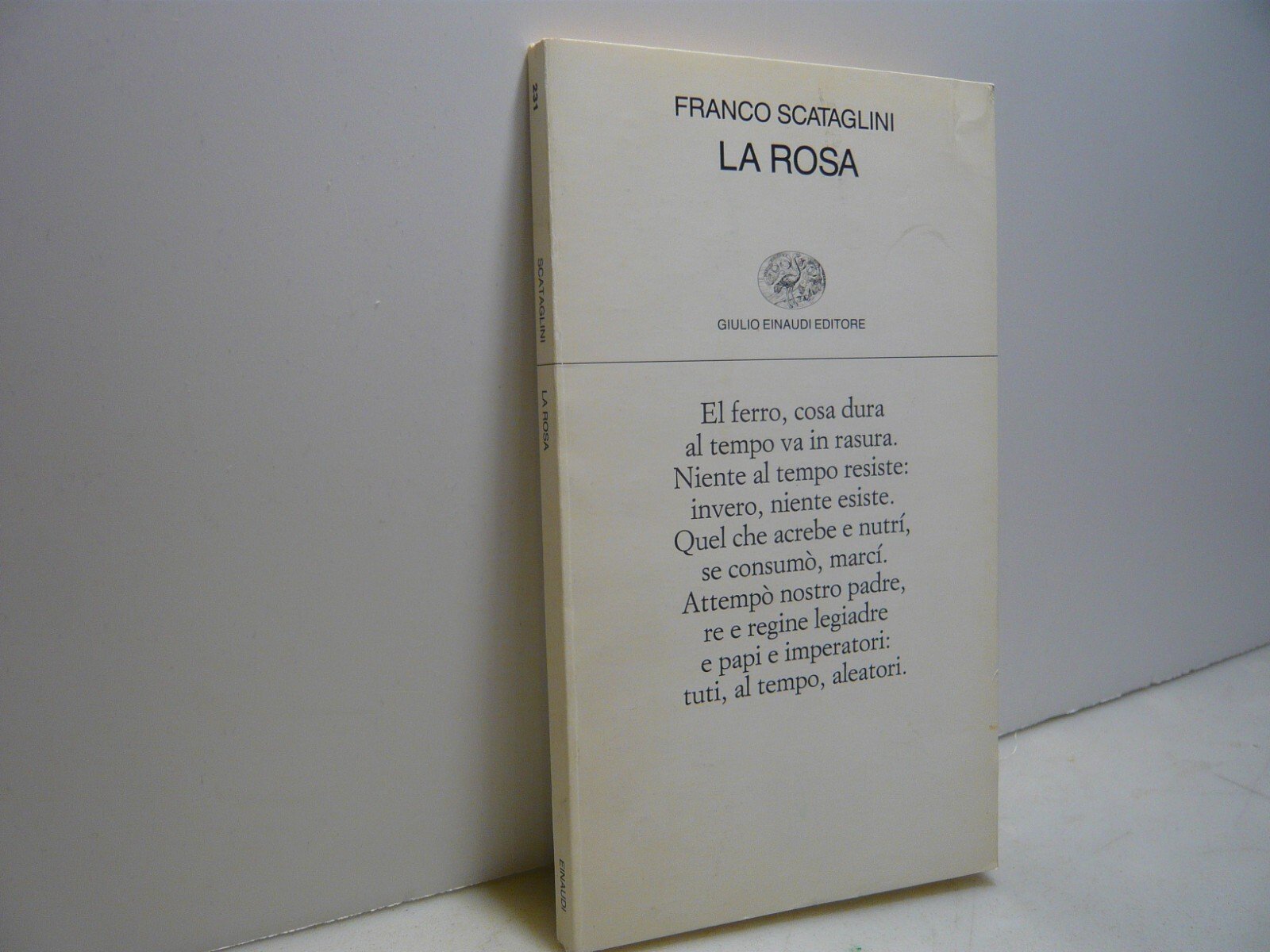 Franco ScatoliniLA ROSAGiulio Einaudi editore s.p.a., Torino, 1992Brossura, 18x10,5 cm, pp. 1-101Con prefazione di Cesare SegreCollezione di poesia n. 231Peso: g. 81cod 1593CONDIZIONI DEL LIBRO:Il libro è in buone condizioni, con copertina leggermente consumata, la prima pagina è scritta a matita, il resto sono ingiallite.