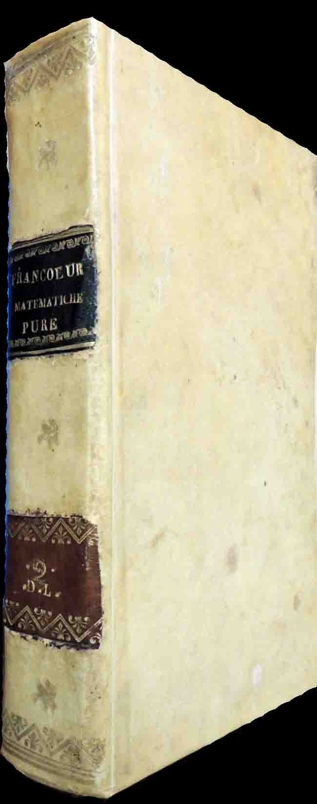 Corso completo di matematiche pure di L. B. Francoeur. Opera destinata agli allievi delle scuole normale e politecnica, ad a’ candidati che si preparano ad esservi ammessi. Tomo secondo, presso C. Batelli e Comp., Napoli 1844, seconda ed. napoletana, pp. 647, 3 c. di tavv. f.t. ripiegate ill. b.n., cm 21, bella legatura coeva in tutta pergamena con titoli e fregi in oro entro tasselli al dorso e tagli spruzzati. Lievi tracce d’uso, minime fioriture, per il resto ottimo esemplare con legatura solida e di pregio.
