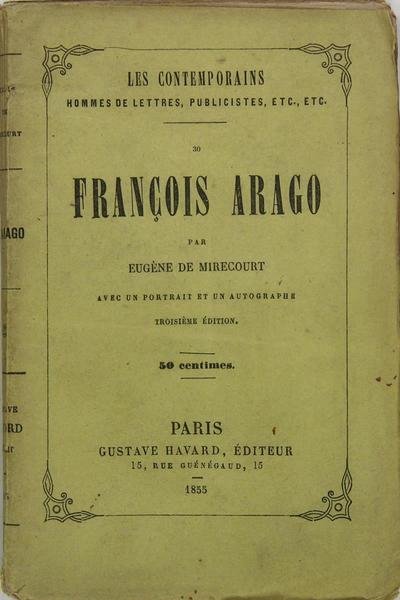 Paris, Gustave Havard édtieur, 1855. In/16 broché, couverture imprimée, un portrait en frontispice, reproduction d’une lettre autographe in-fine, 96 p. François Jean Dominique Arago (1786 - 1853), astronome, physicien et homme politique français.