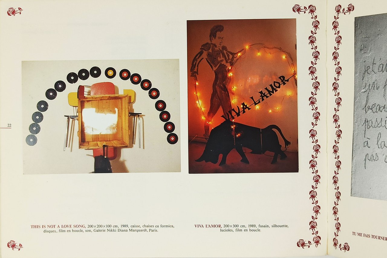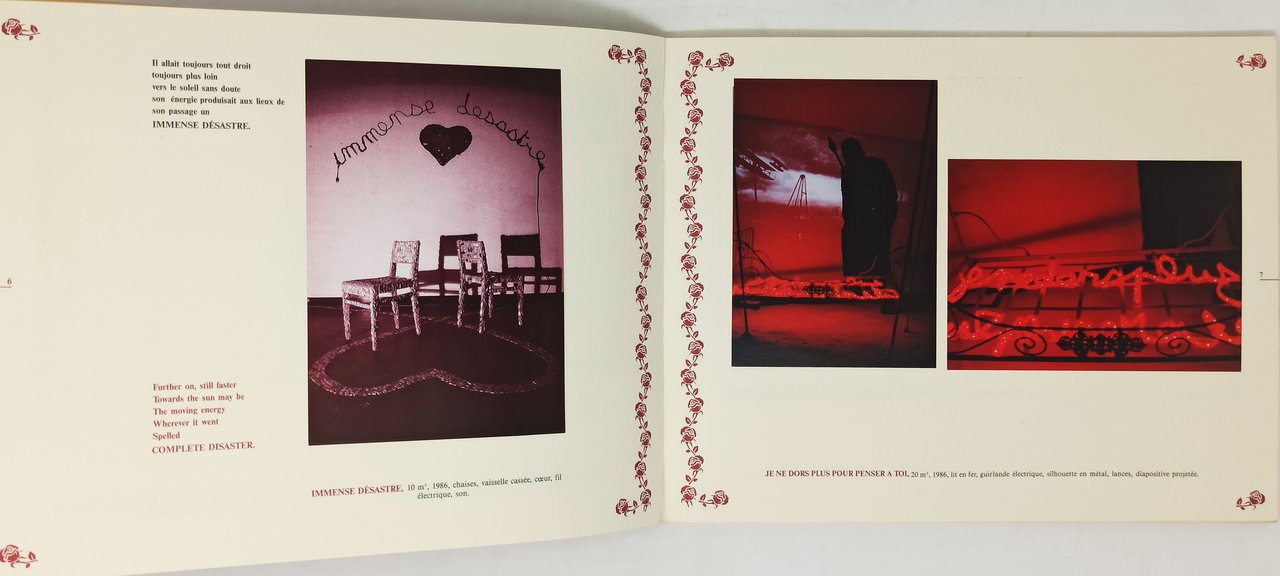 Catalogo. La Criée, Halle d'Art Contemporain, Rennes. Lingua del testo: francese. Dimensioni: 26,5 x 20,5 cm circa. Numerosissime immagini fotografiche a colori, applicate sulle pagine. Stato di conservazione: una piega sull'angolo inferiore del piatto anteriore, qualche leggera usura sulla copertina e sui suoi bordi, leggere tracce (ombre) lasciate da pezzetti di nastro adesivo (utilizzato, in passato, per fissare una fodera trasparente) sulla prima e sull'ultima pagina ma, nel complesso, un buon esemplare. Catalogo molto particolare per la sua veste editoriale. Quest'opera è stata la prima pubblicazione dell'artista francese.