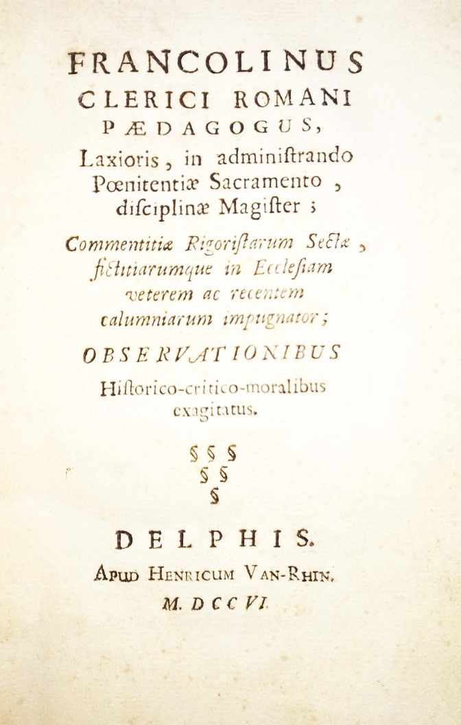 Francolinus clerici Romani paedagogus, laxioris, in administrando poenitentiae sacramento, disciplinae magister, commentitiae rigoristarum sectae […]. Observationibus historico-critico-moralibus exagitatus.