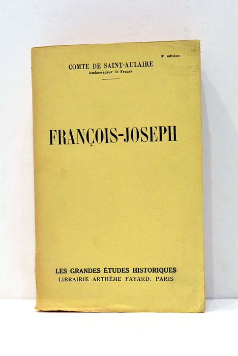 598 pages. 3 feuillets. (19x12cm). Broché. Couverture légèrement brunie avec signes de rousseurs. Dos et coins un peu émoussés. Publié à Paris en 1945, cet ouvrage du Comte de Saint-Aulaire offre un regard intime sur François-Joseph, figure emblématique de l'histoire européenne. À travers ce livre, l'auteur, naviguant entre les rôles de diplomate et d'historien, explore la complexité d'un règne qui a façonné l'Autriche-Hongrie à l'aube du XXe siècle. Dans le contexte de l'après-guerre, cette biographie résonne particulièrement, offrant une perspective sur les enjeux politiques et sociaux de l'époque, tout en établissant des parallèles subtils avec les défis contemporains de la reconstruction et de la réconciliation en Europe. Papier légèremetn bruni avce petites atches éparsesa sans gravité. Bon exemplaire.