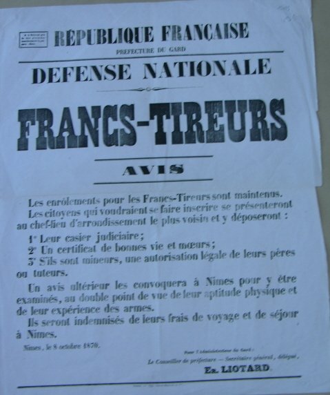 Nimes, Typ; Clavel Ballivet, 1870. 55 x 44 cm Affiche. Avis pour l'enrôlement de francs-tireurs. Département du Gard.