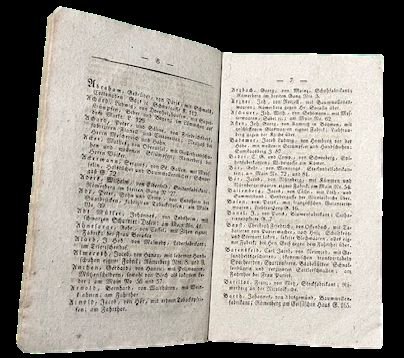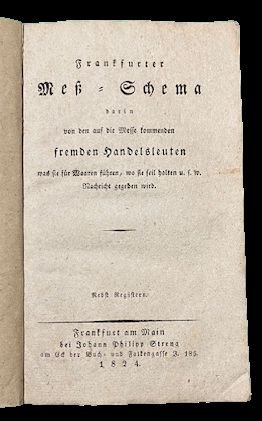 In 8°; 88 pp. Brossura coeva azzurra. Prima ed unica rarissima edizione di questa importante fonte per la storia economica e commerciale della città di Francoforte sul Meno. L'opera contiene i nomi dei commercianti con le loro attività che portavano avanti nel 1824, a Francoforte sul Meno. First edition. Esemplare in ottime condizioni di conservazione.
