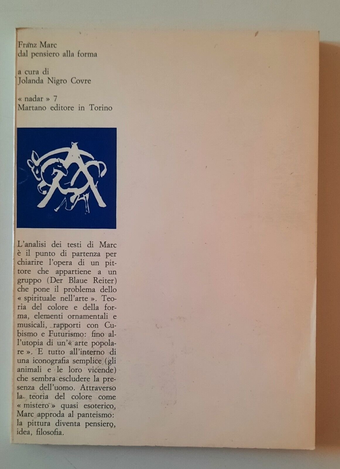 FRANZ MARC DAL PENSIERO ALLA FORMA MARTANO EDITORE NADAR 1971In 8° , legatura editoriale, copertina illustrata.Lievissimi segni alla copertina.