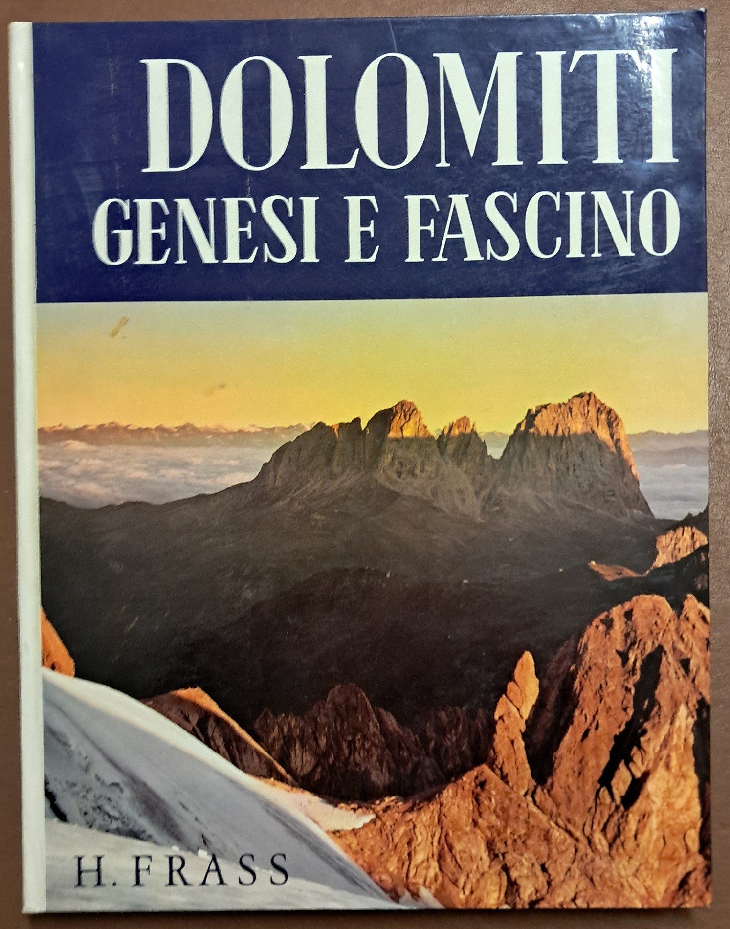 Hermann Frass, Dolomiti. Genesi e fascino, testo geologico di Viktor Welponer, Casa Editrice Athesia, Bolzano 1970, seconda ed., pp. 117, ill. b.n. e col., cm 30, cart. ed. con titoli al dorso e titoli e ill. col. al piatto. Titolo originale: Wulderwlet del Dolomiten. Traduzione di Willy Dondio con la collaborazione di V. Welponer. Leggere tracce d’uso, minima brunitura della carta, per il resto ben conservato.