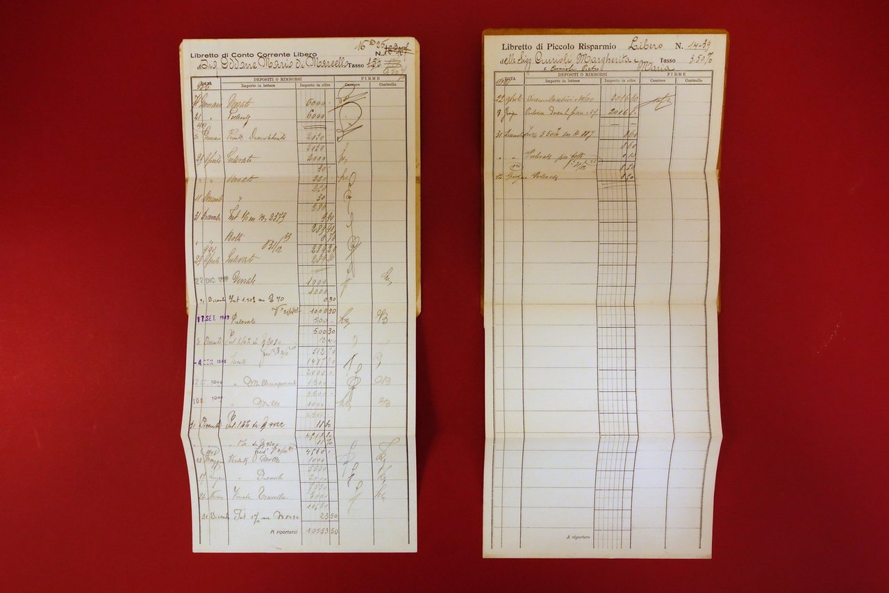 2 libretti; Tip. Battezzati, Valenza, 1921 (libretto di piccolo risparmio) e 1936 (libretto di conto corrente); due libretti a fisarmonica precompilati a stampa, sezioni bianche compilate manualmente oppure bianche; in qualche caso la data dei prelievi / versamenti è stata apposta mediante timbro (vedi foto).Cartoncino ed. Dimensioni: cm 11x19.