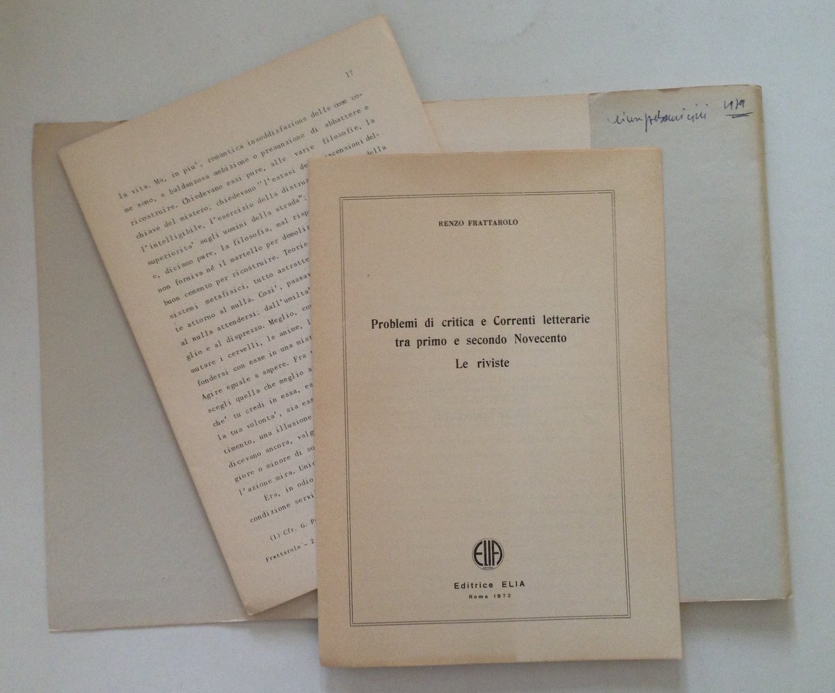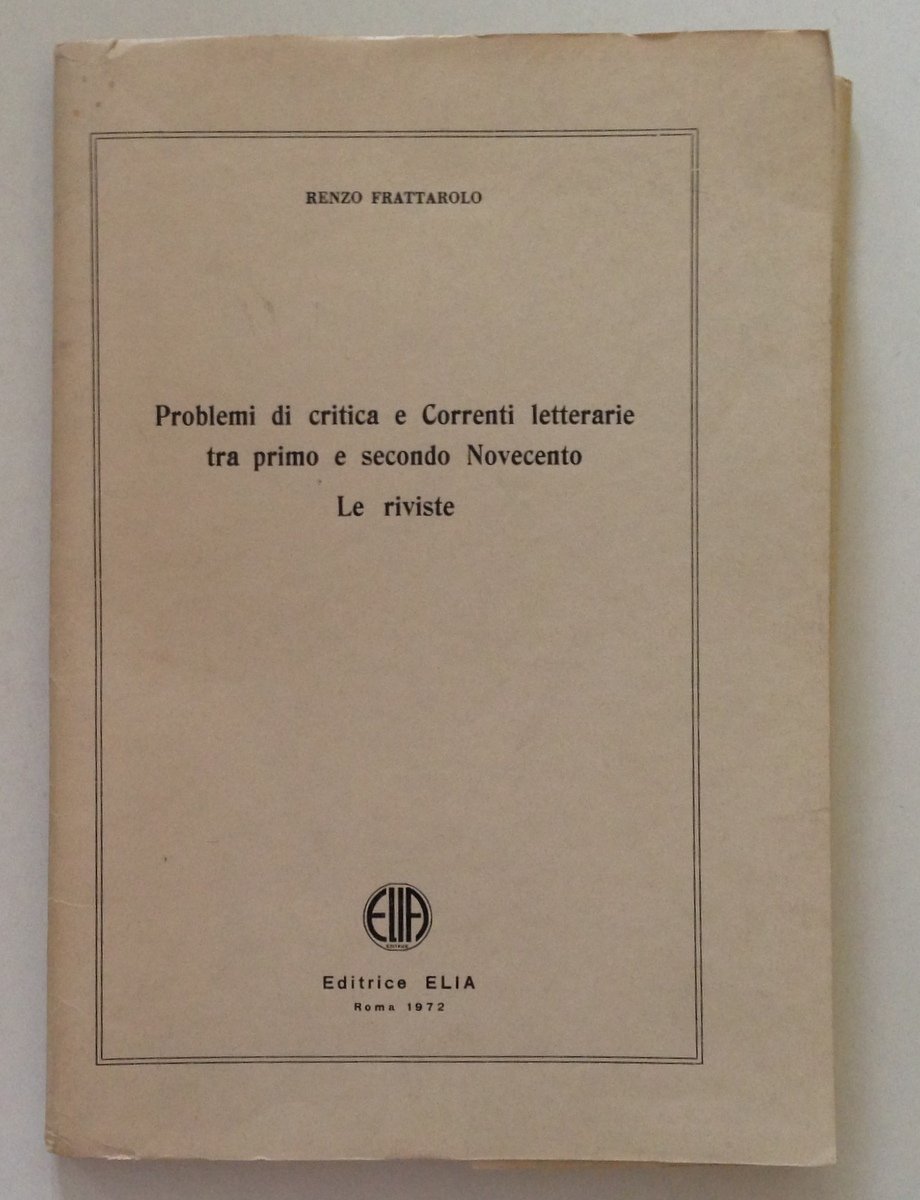 Renzo Frattarolo, Problemi di critica e Correnti Letterarie tra primo e secondo Novecento Le riviste Editrice Elia, Roma 1972, cm. 25x17.5, pp. 136, cartelletta con 9 fascicoli tipo litografici, firma ex proprietario sulla bandella posteriore della cartelletta. Condizioni di conservazione Esemplare in buone condizioni con leggere tracce d'uso e con minime bruniture. SETT104.L10009 MT