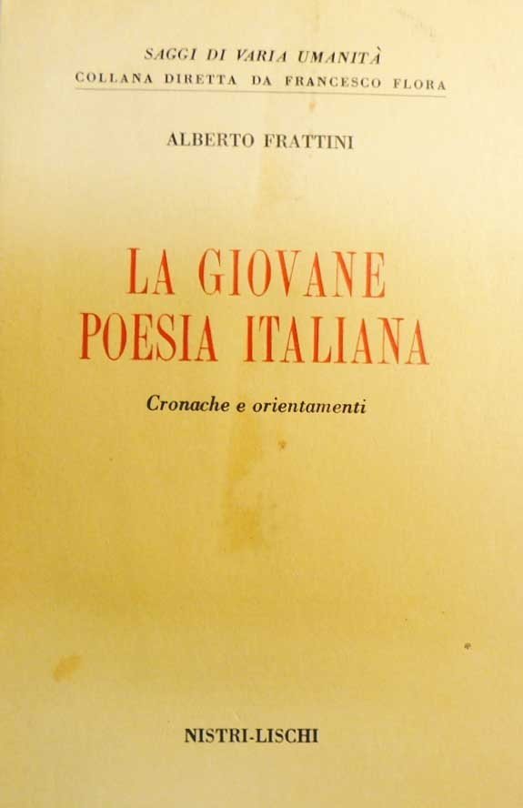 Alberto Frattini, La giovane poesia italiana. Cronache e orientamenti, Nistri-Lischi, s.l. (ma stampato a Pisa, per i tipi delle Industrie Grafiche V. Lischi e Figli, pp. 317, cm 19, br. ed. Collana Saggi di varia umanità, n. 45. Volume mancante di sovraccoperta. Tracce di nastro adesivo alla seconda e alla terza di copertina, uno strappetto senza mancanze alla quarta di copertina, lievissima gora al margine superiore esterno delle prime carte, per il resto volume ancora in buono stato.